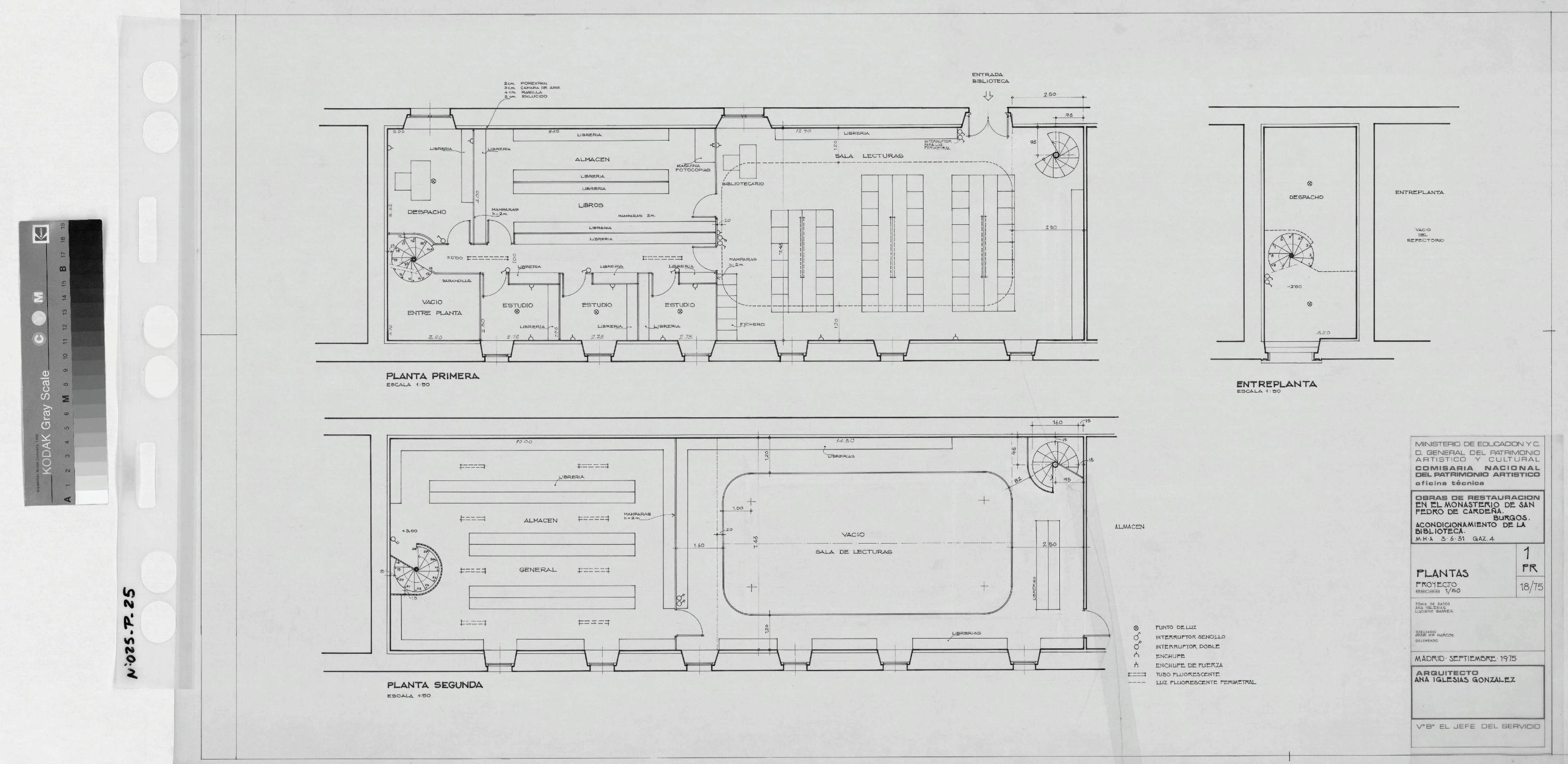 MONASTERIO DE SAN PEDRO DE CARDEÑA. BURGOS- ACONDICIONAMIENTO DE LA BIBLIOTECA.: PLANTAS PROYECTO. Planta primera , planta segunda y entreplanta, este plano es de distribucion, mobiliario y electricidad. Plantas acotadas y con alturas.planos realizados por personas contratadas por el INEM.