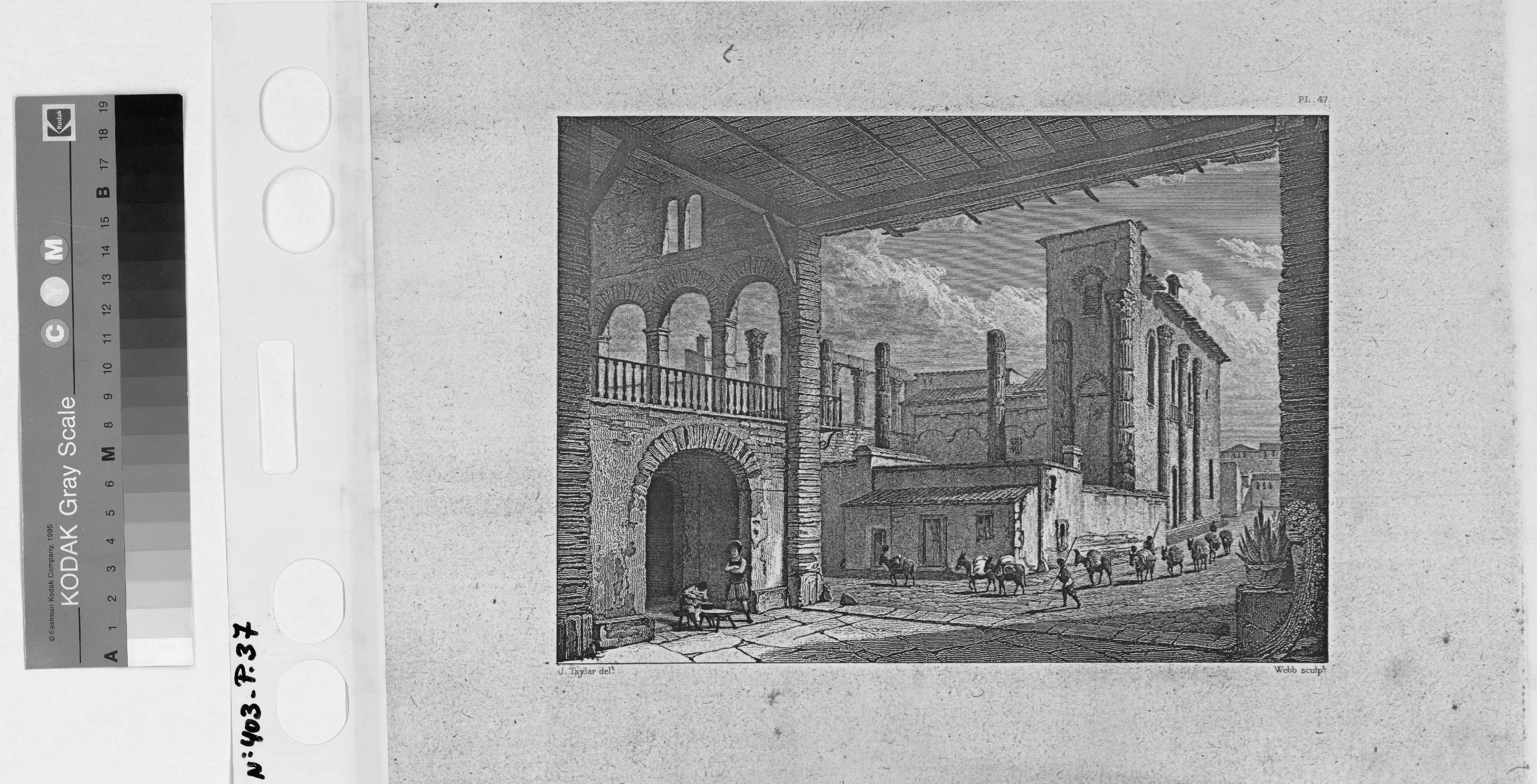 OBRAS DE RESTAURACION EN EL TEMPLO ROMANO DE MERIDA (Badajoz): GRABADO DE EPOCA Aparece el Templo con escenas callejeras