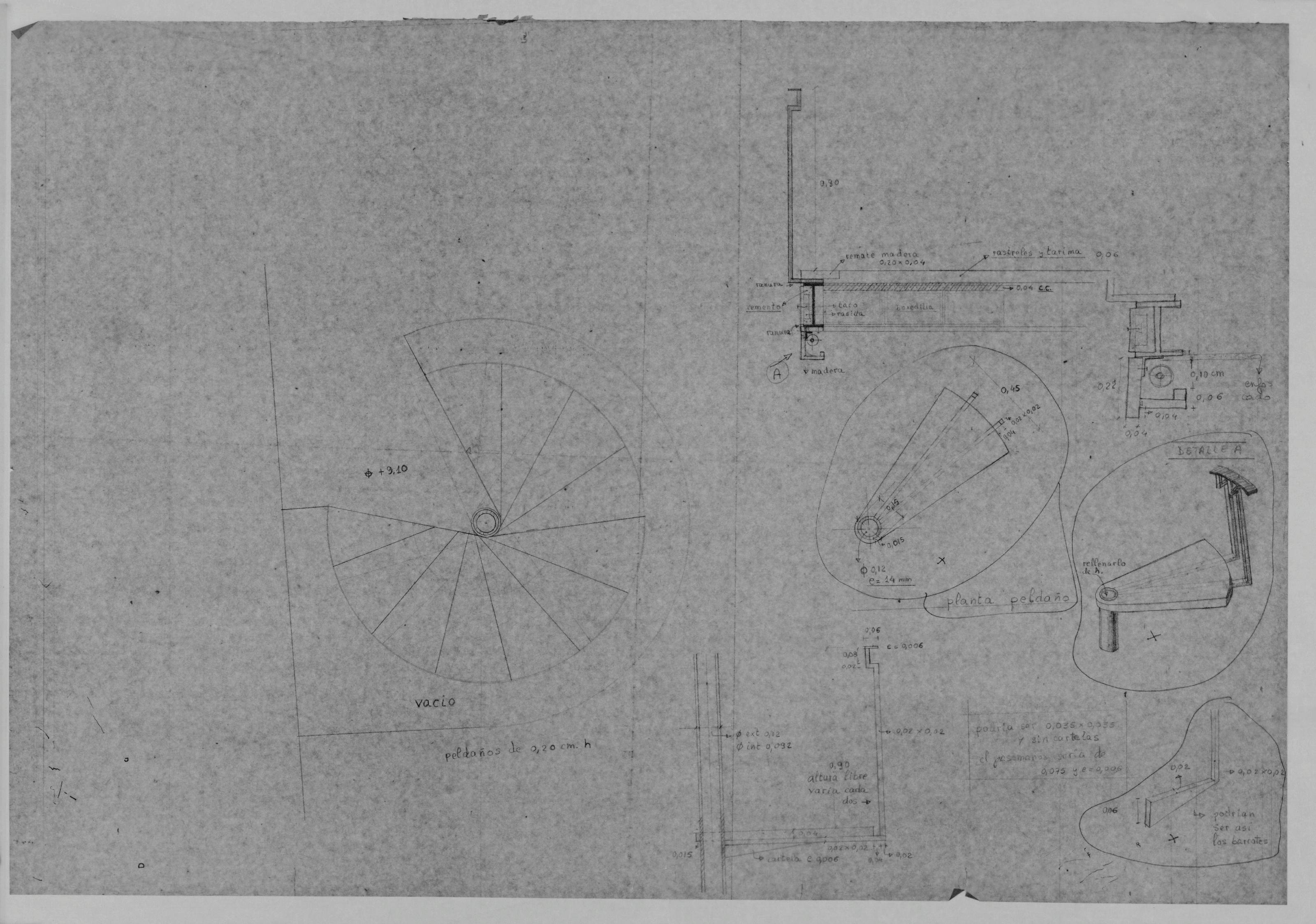 MONASTERIO DE SAN PEDRO DE CARDEÑA. BURGOS- ACONDICIONAMIENTO DE LA BIBLIOTECA.: PLANO DE DETALLES. En este plano aparece dibujado a mano alzada unos detalles de escalera, pletinas, pasamanos etc, el fondo del plano esta oscurecido planos realizados por personas contratadas por el INEM.