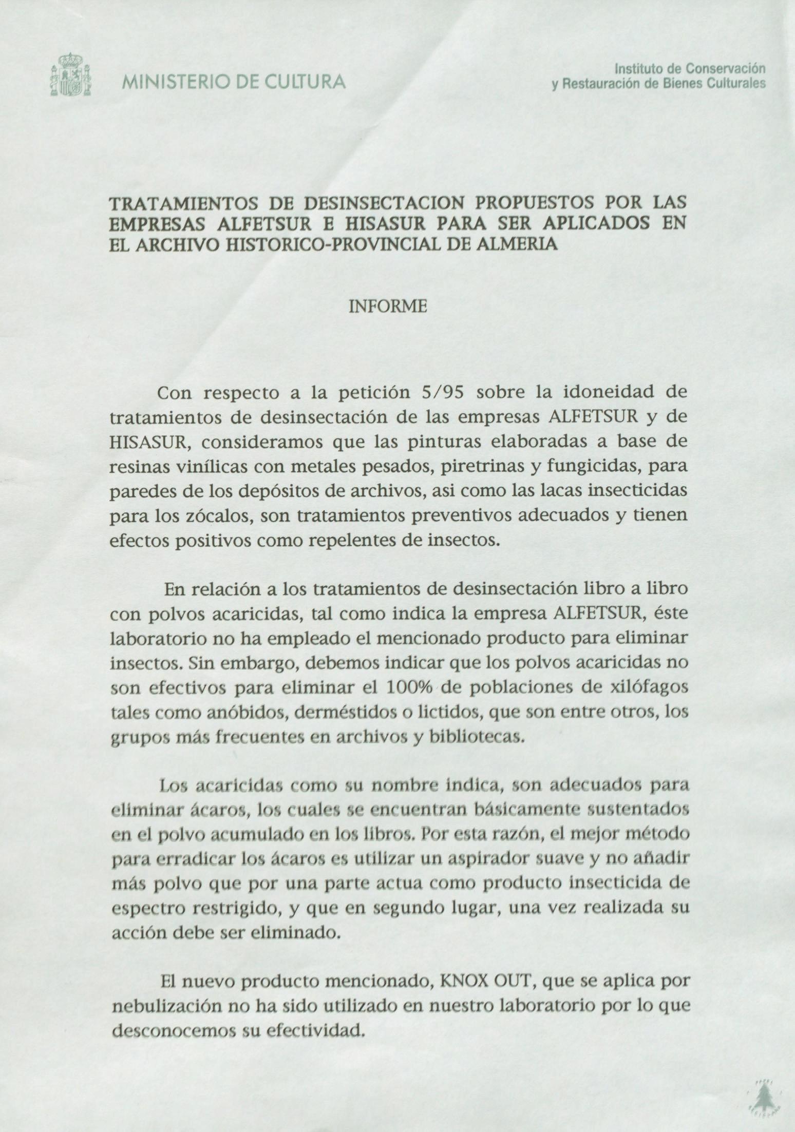 Informe sobre tratamientos de desinsectación de documentos del Archivo Histórico Provincial de Almería (Almería)