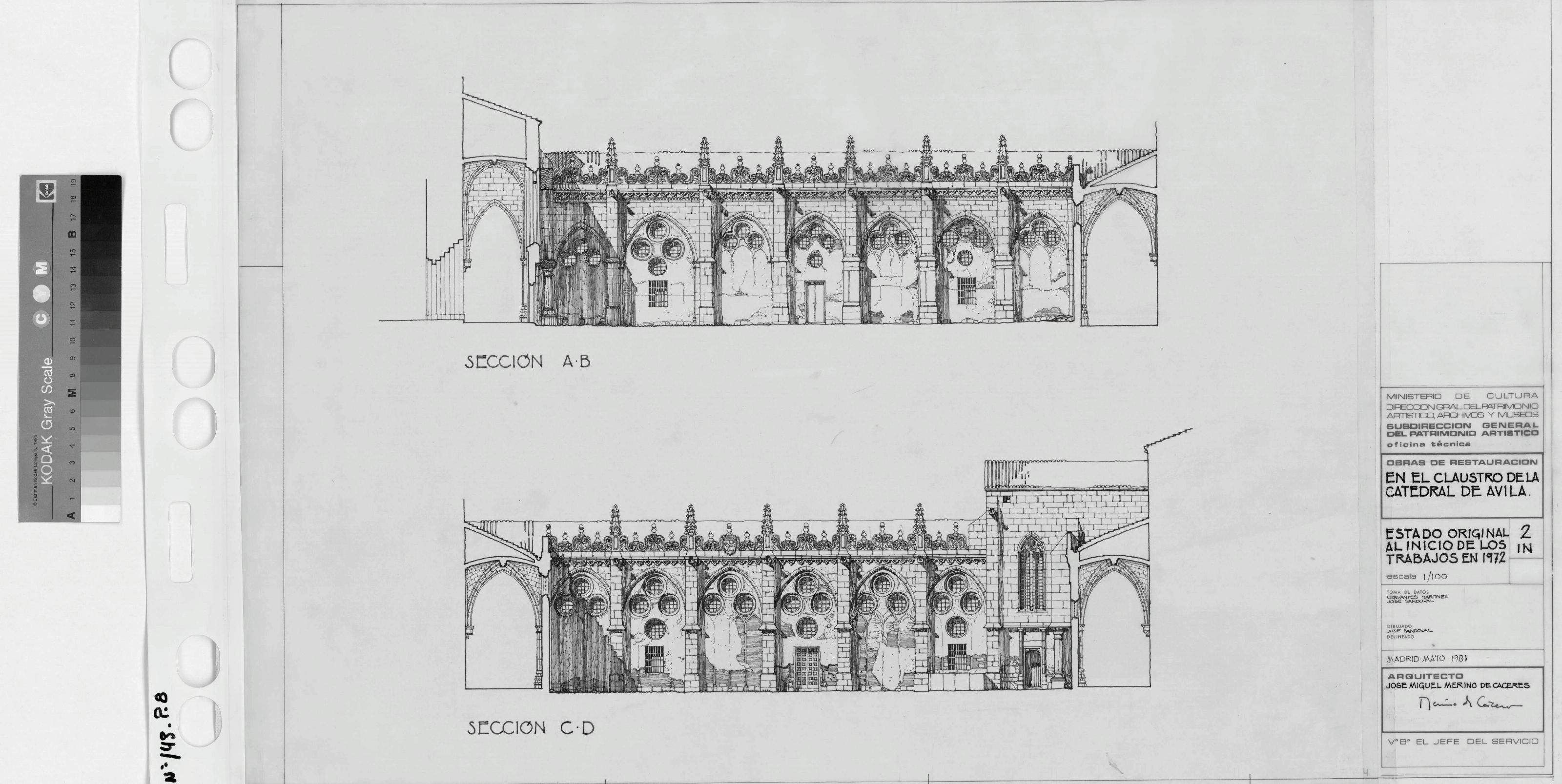 LA CATEDRAL DE AVILA OBRAS EN EL CLAUSTRO: ESTE PLANO TIENE DOS SECCIONES .POR EL CLAUSTRO: A-B Y C-D, EL ESTADO ES ORIGINAL AL INICIO DE LOS TRABAJOS REALIZADOS EN 1.972, ESTA DIBUJADO CON MUCHO DETALLE, SE PUEDE APRECIAR LA FACHADA DEL CLAUSTRO.
