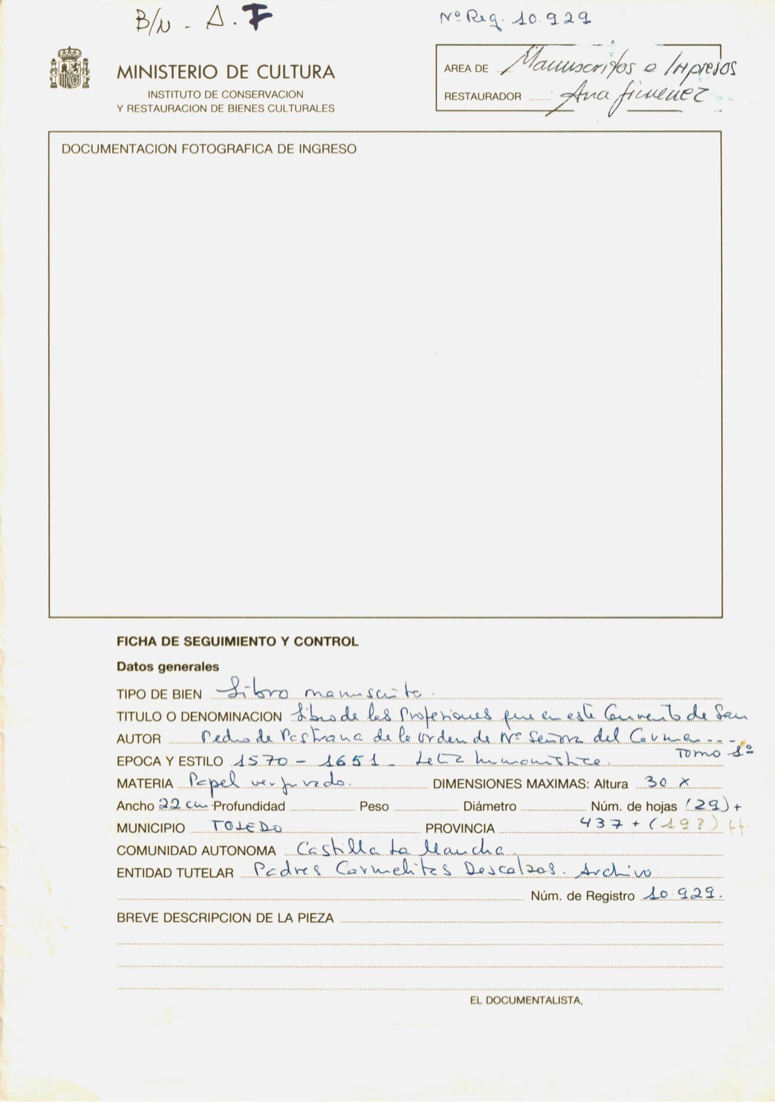 Restauración de piezas documentales referentes a la vida de Santa Teresa de Jesús y San Juan de la Cruz procedentes del Convento de los Padres Carmelitas Descalzos-casa natal de Santa Teresa (Ávila)