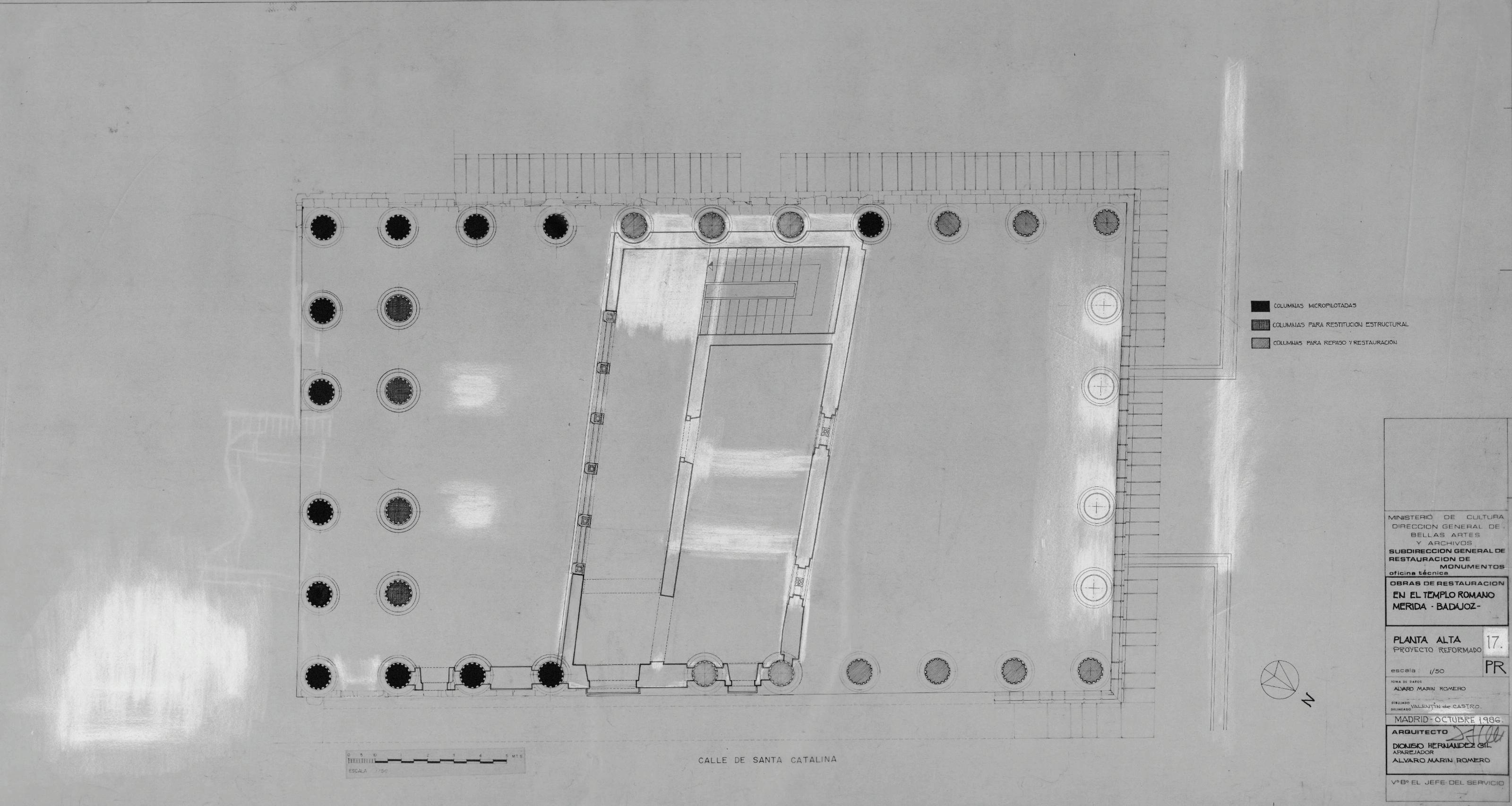 OBRAS DE RESTAURACION EN EL TEMPLO ROMANODE MERIDA (Badajoz): PLANTA ALTA - PROYECTO REFORMADOCon leyenda de los diversos estados de las columnasFirmado