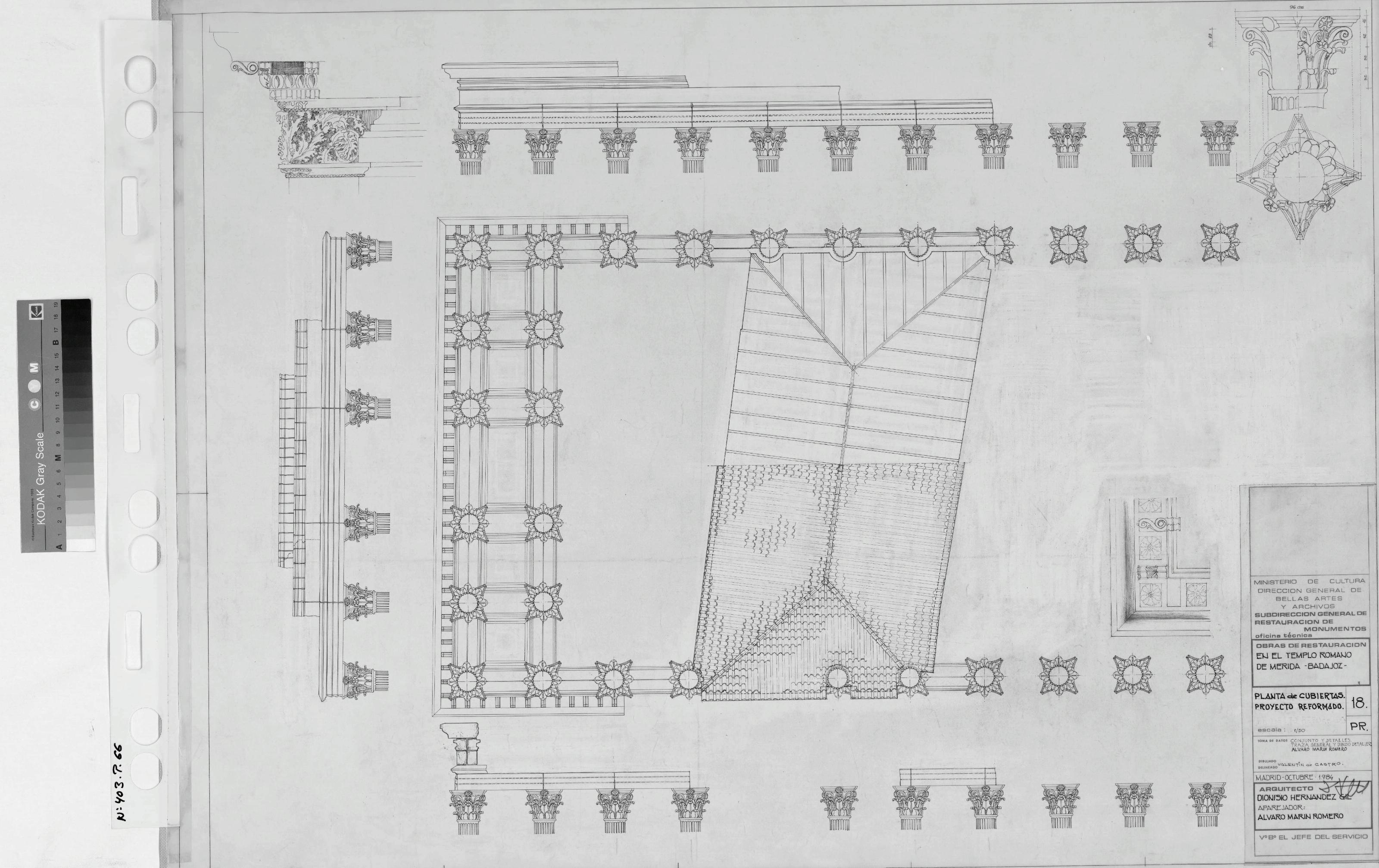 OBRAS DE RESTAURACION EN EL TEMPLO ROMANO DE MERIDA (Badajoz): PLANTA DE CUBIERTAS - PROYECTO REFORMADO Con representación de las proyecciones de las zonas altas de las columnatas en los diferentes alzados Con detalle de capitel en planta y alzado E: 1/10 Firmado