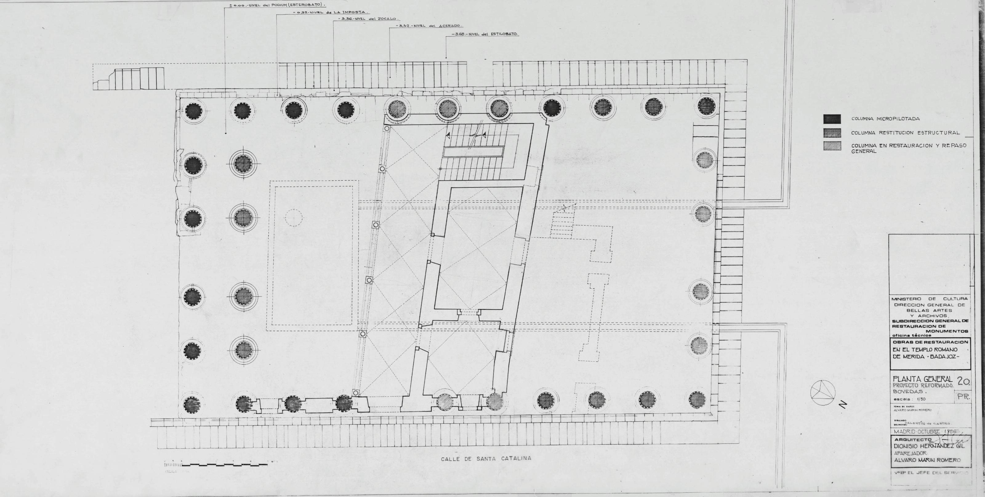 OBRAS DE RESTAURACION EN EL TEMPLO ROMANO DE MERIDA (Badajoz): PLANTA GENERAL - PROYECTO REFORMADO - BOVEDAS Con cotas de nivel de las diferentes plataformas Con leyenda de los diversos estados de las columnas Con representación en linea de puntos de las proyecciones de bóvedas Con escala gráfica. Firmado