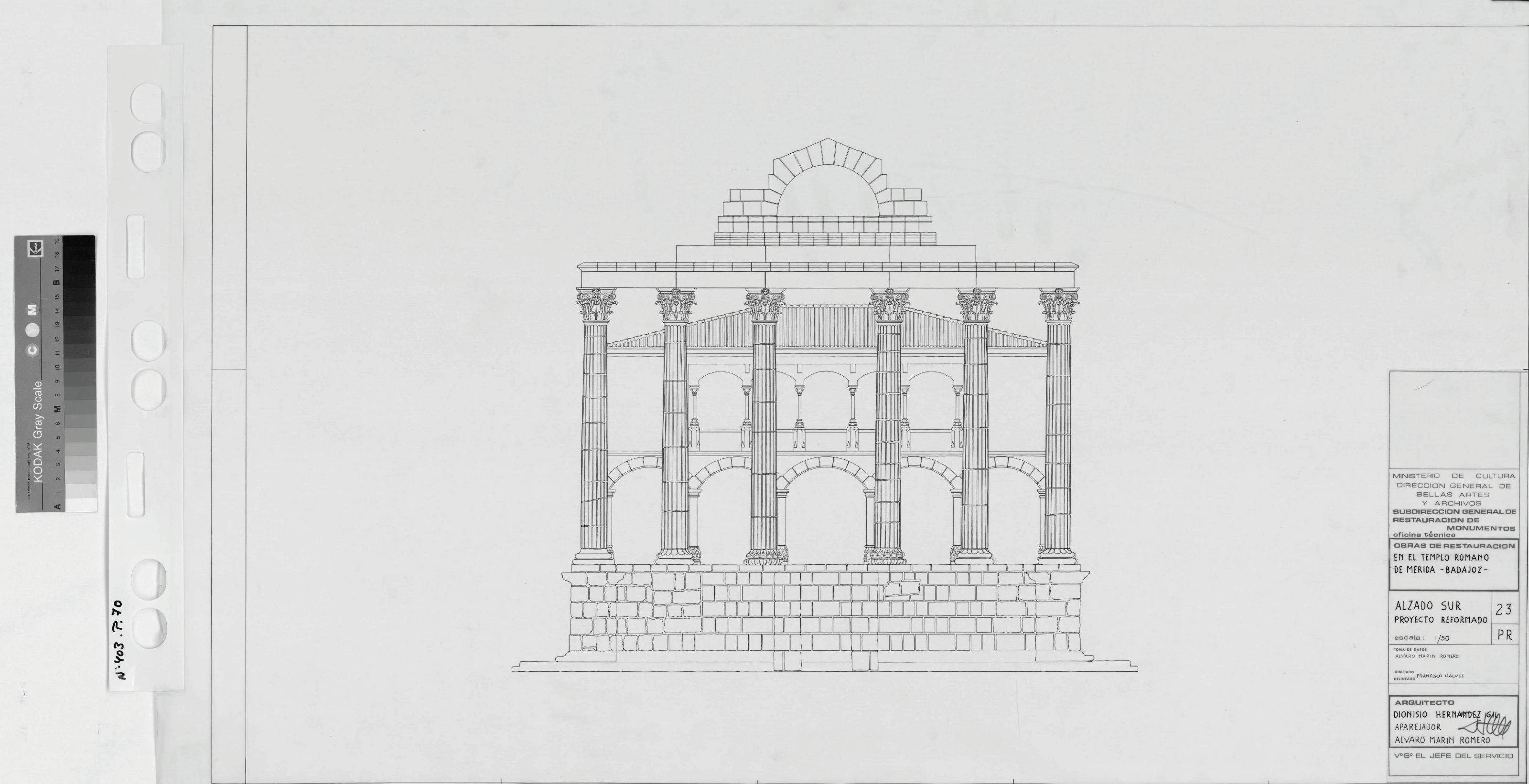 OBRAS DE RESTAURACION EN EL TEMPLO ROMANO DE MERIDA (Badajoz): ALZADO SUR - PROYECTO REFORMADO Con despieces y rayados Sin notas ni cotas Firmado