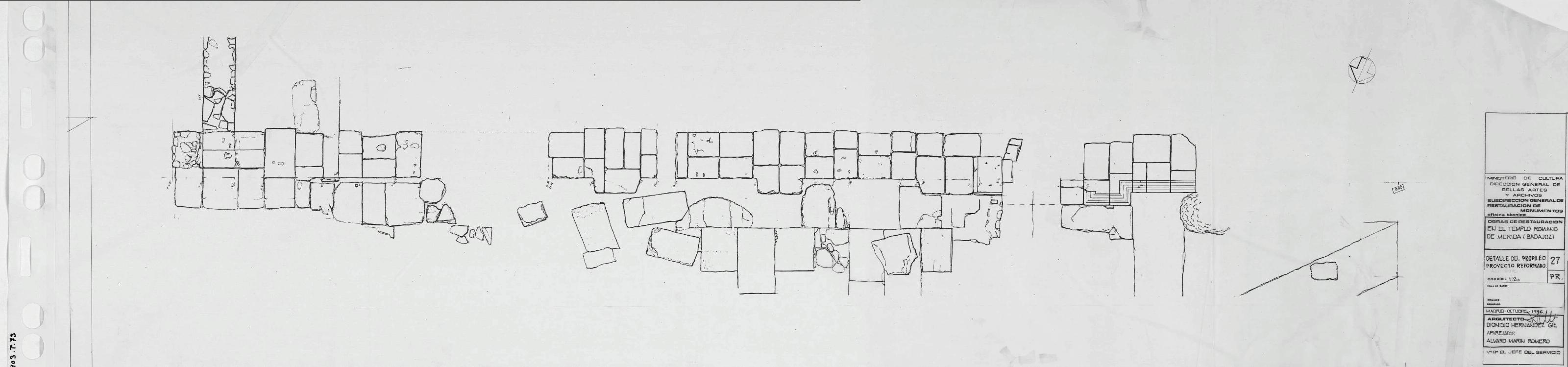 OBRAS DE RESTAURACION EN EL TEMPLO ROMANO DE MERIDA (Badajoz): DETALLE DEL PROPILEO - PROYECTO REFORMADO - ALA SUR Es un detalle alargadocon aspecto de croquis de una toma de datos en muro y aledaños. Sin notas ni cotas. Firmado