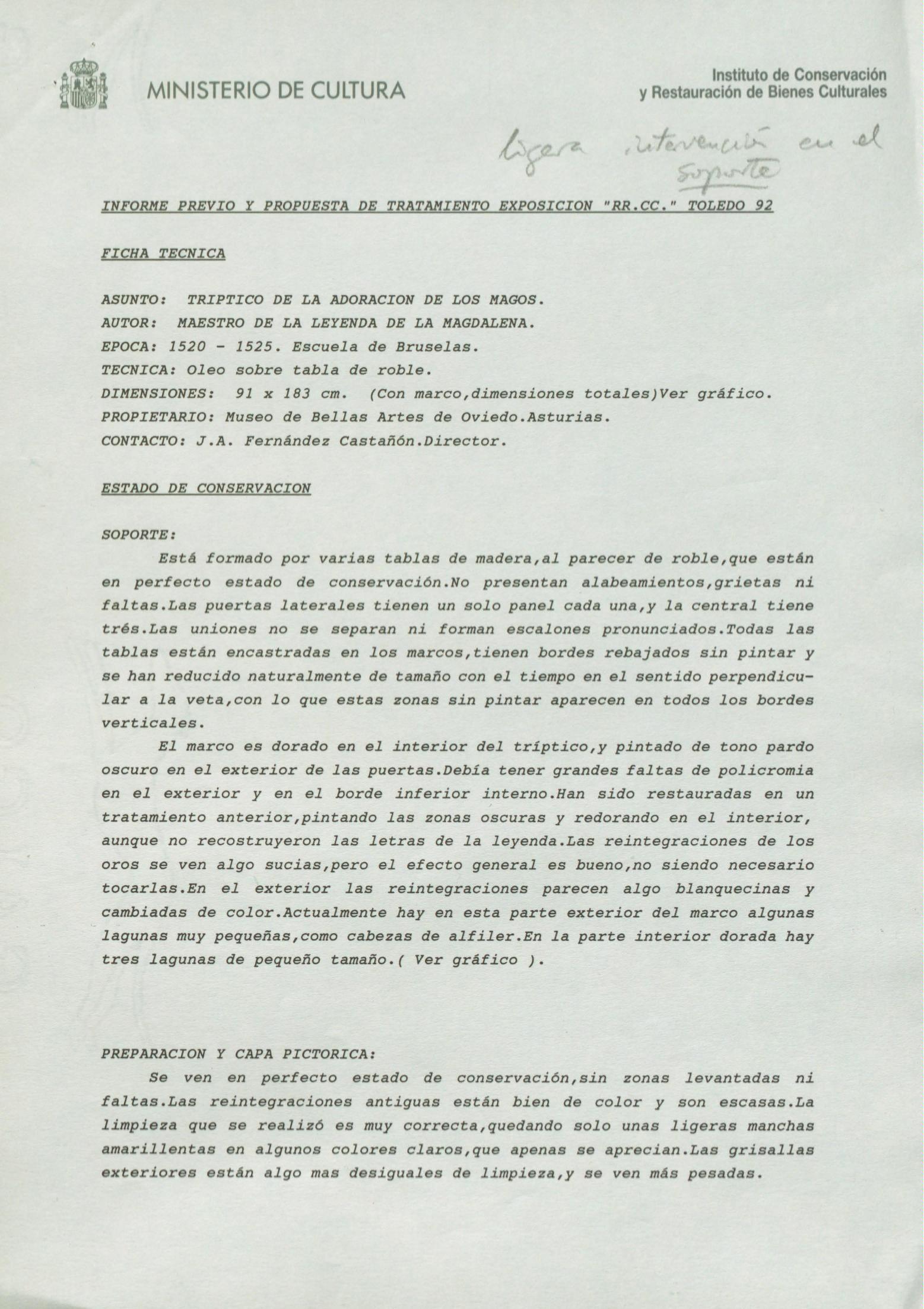 Informe previo sobre el tríptico "La Adoración de los Reyes Magos", del Maestro de la Leyenda de la Magdalena, procedente del Museo de Bellas Artes de Asturias