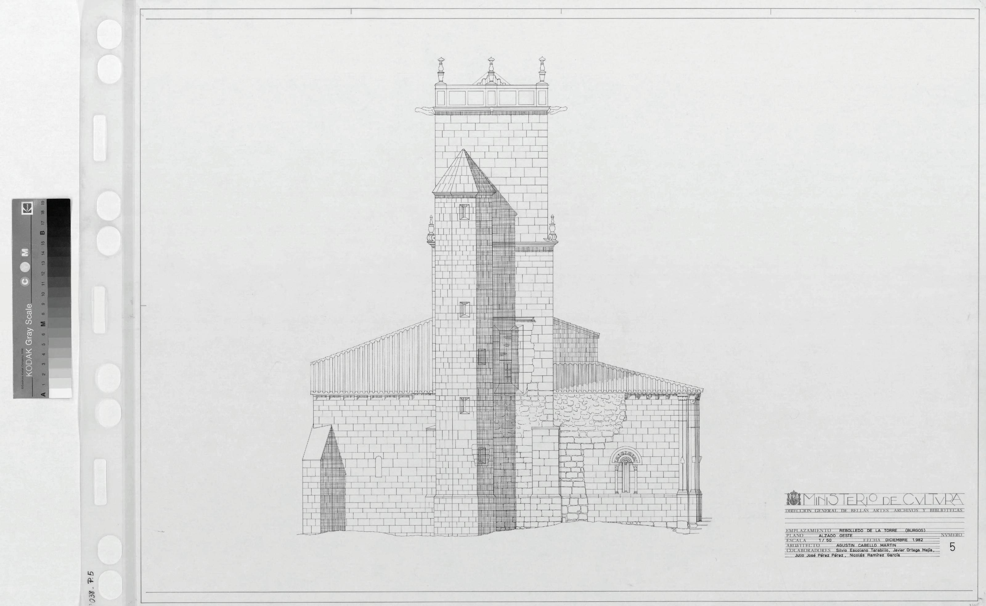 IGLESIA PARROQUIAL DE REBOLLEDO DE LA TORRE -BURGOS -: ALZADO OESTE. Plano dibujado con mucho detallado, Planos realizados por personas contratadas por el INEM.