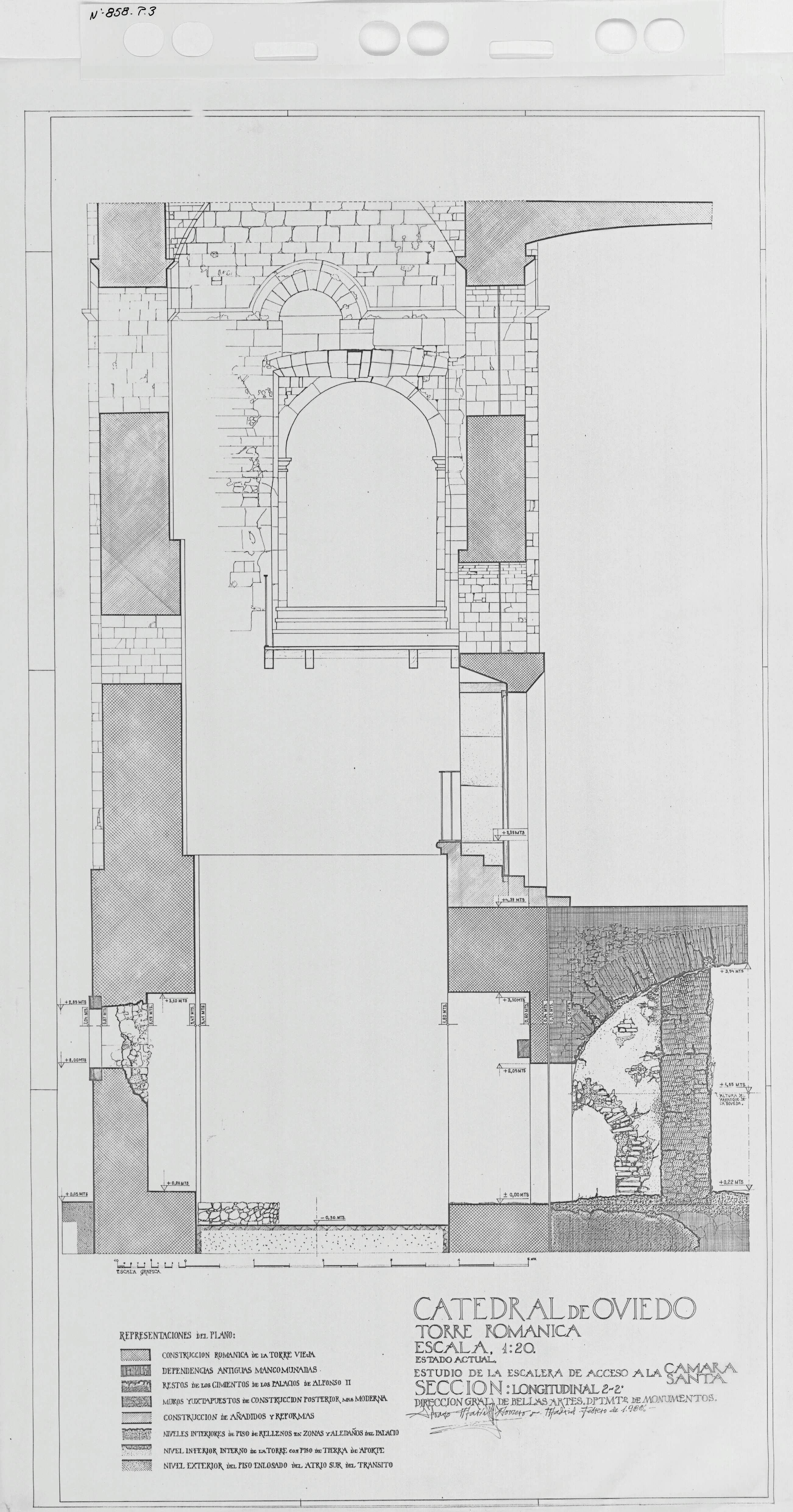 CATEDRAL BASILICA DEL SALVADOR- SANTA IGLESIA CATEDRAL DE OVIEDO: TORRE ROMANA SECCION SECCION LONGITUDINAL 2-2! ESTADO ACTUAL CON DENOMINACION DE TEXTURAS, ESTUDIO DE LA ESCALERA DE ACCESO A LA CAMARA SANTA.