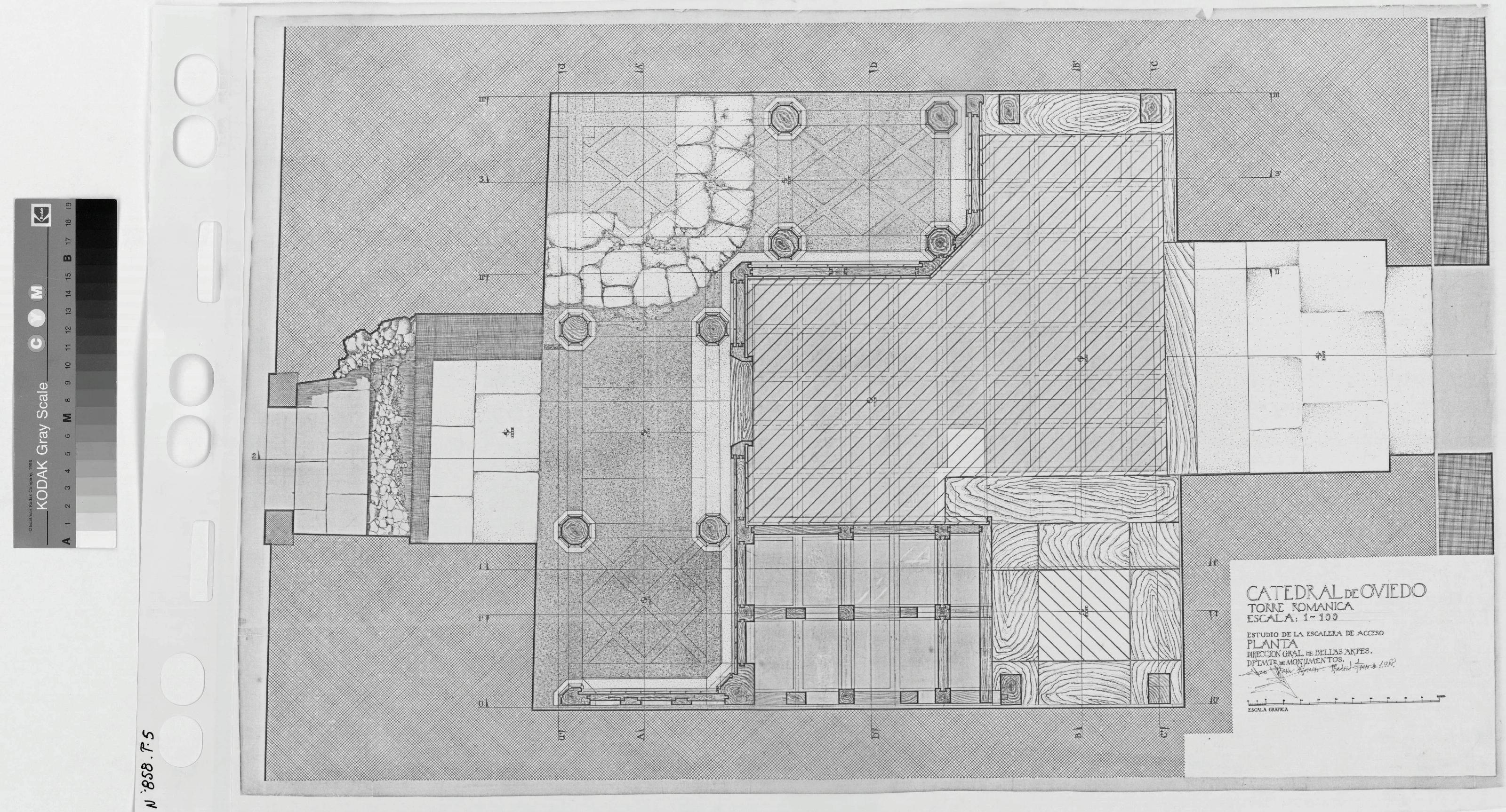 CATEDRAL BASILICA DEL SALVADOR- SANTA IGLESIA CATEDRAL DE OVIEDO: PLANTA ESTUDIO DE LA ESCALERA DE ACCESO, PLANO CON COTAS Y REPRESENTACION DE LOS DISTINTOS MATERIALES.