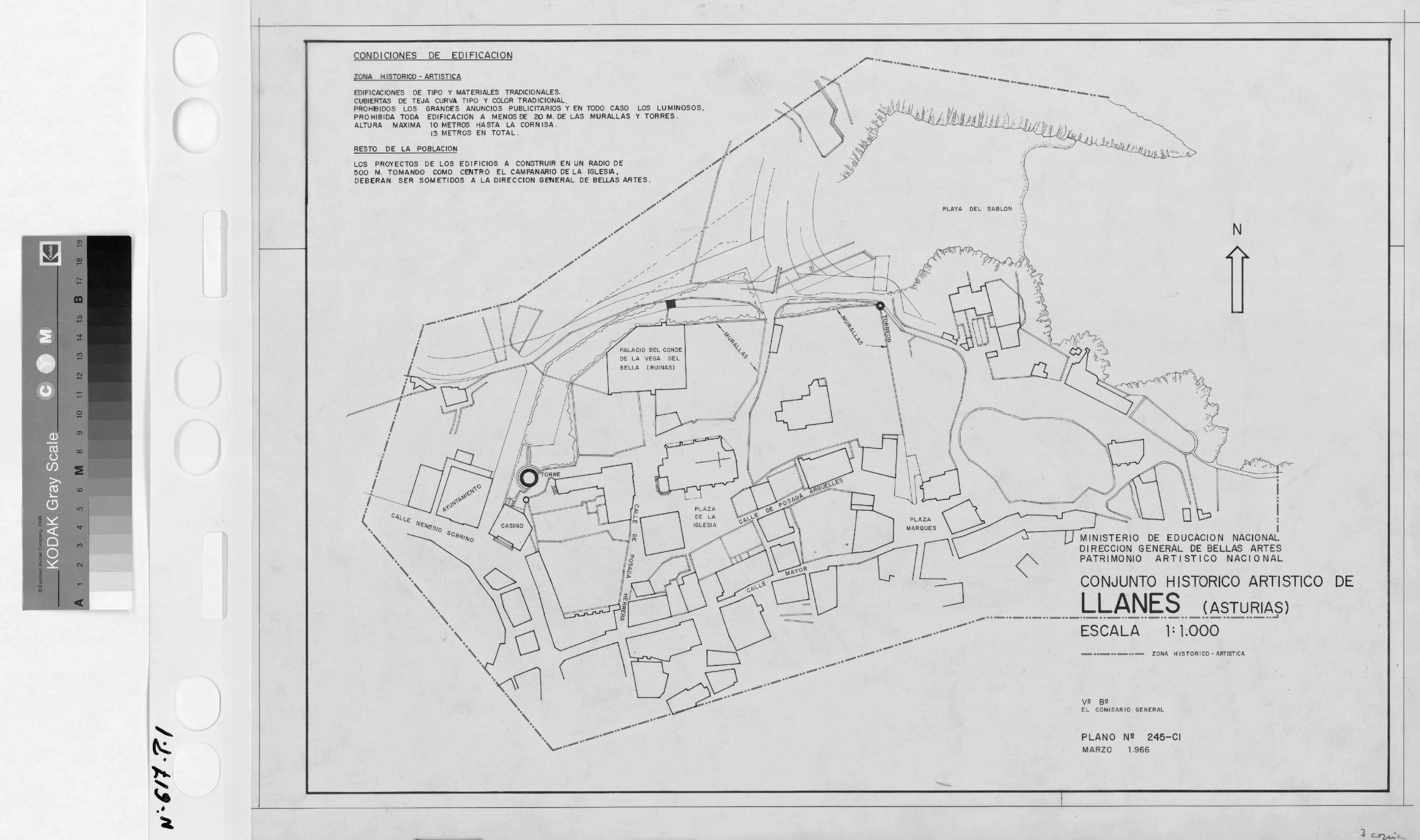 CONJUNTO HISTORICO ARTISTICO DE LLANES: PLANTA GENERAL DEL CONJUNTO HISTORICO ARTISTICO CON DENOMINACION DE MONUMENTOS, CALLES Y RECINTO AMURALLADO, ASI COMO ESPECIFICACION DE USOS SEGÚN DISTINTAS ZONAS. PLANO Nº 245-CI