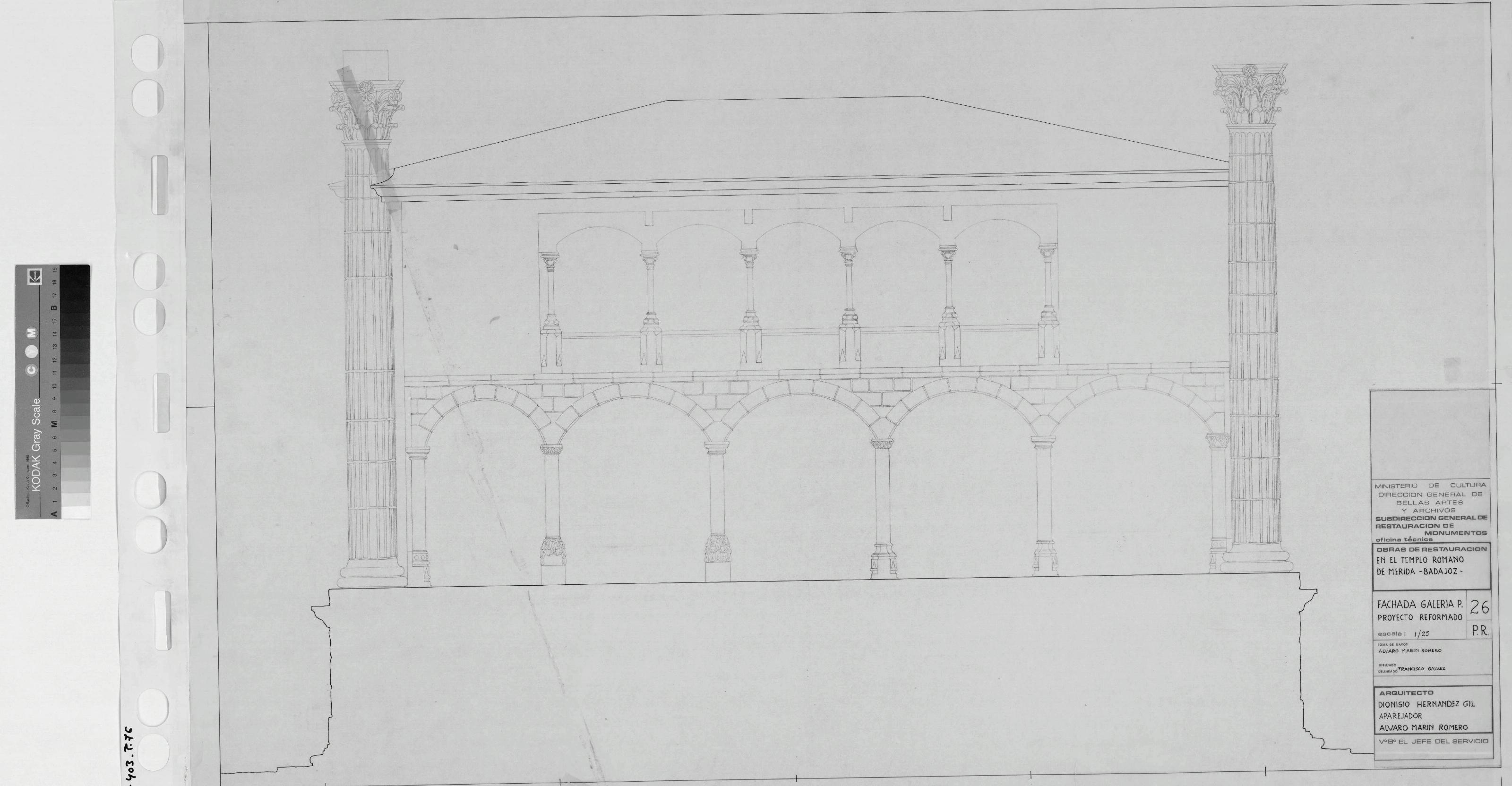 OBRAS DE RESTAURACION EN EL TEMPLO ROMANO DE MERIDA (Badajoz): FACHADA GALERIA P. - PROYECTO REFORMADO Con despieces y rayados Sin notas ni cotas.