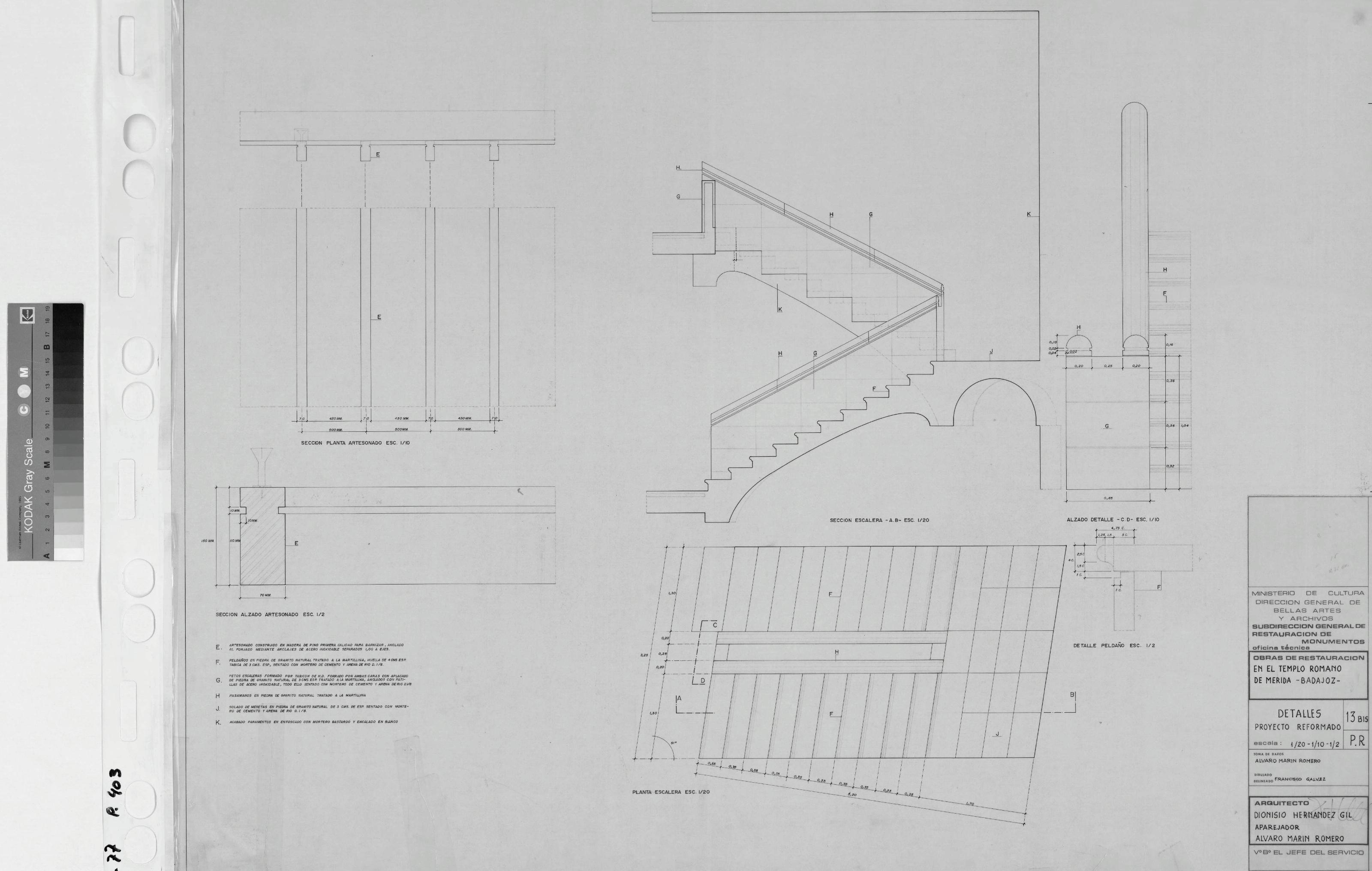 OBRAS DE RESTAURACION EN EL TEMPLO ROMANO DE MERIDA (Badajoz): DETALLES - PROYECTO REFORMADO Correspondientes a Escalera, barandilla y Artesonado a E: 1/20, 1/10 y 1/2 Con leyenda y cotas, Firmado