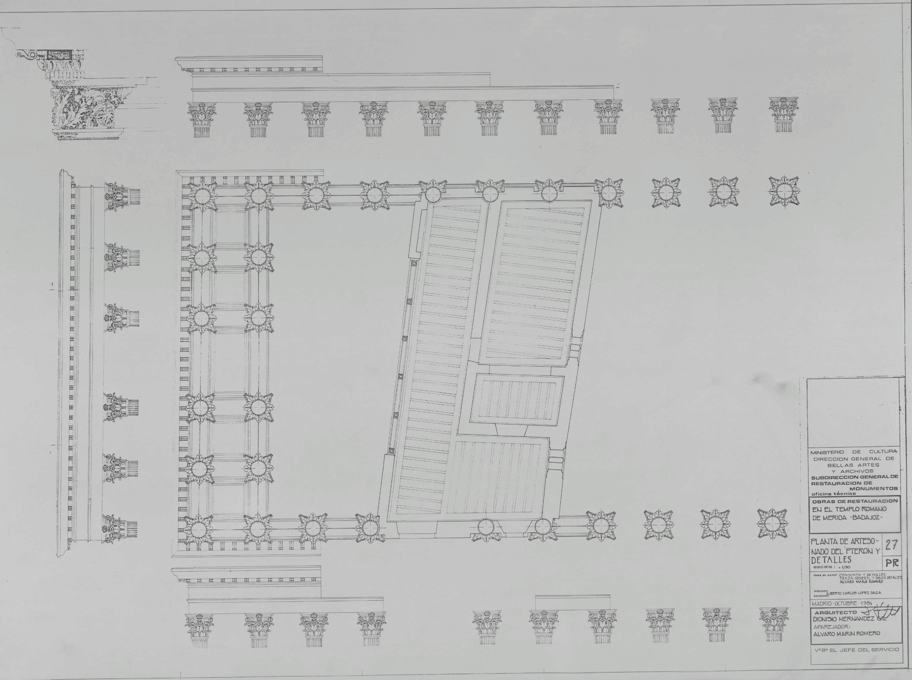 OBRAS DE RESTAURACION EN EL TEMPLO ROMANO DE MERIDA (Badajoz): Es plano 30 BIS PLANTA DE ARTESONADO DEL PTERON Y DETALLES Con abatimientos en planta de cada fachada en zonas altas correspondientes a capiteles y entablamento Con detalles incluyendo armados sin especificar escala Firmado