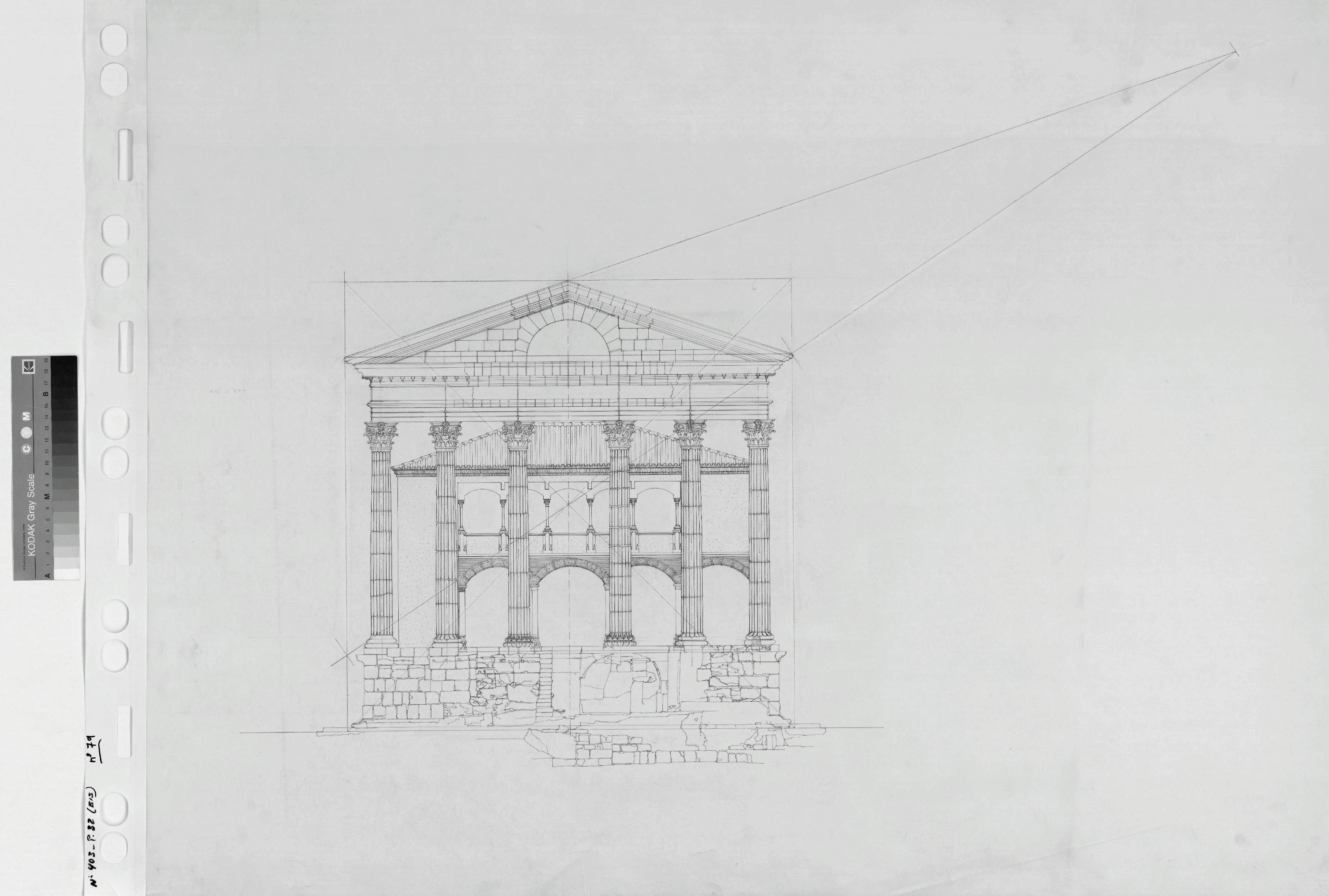 OBRAS DE RESTAURACION EN EL TEMPLO ROMANO DE MERIDA (Badajoz): Es plano 32 BIS ALZADO No parece plano de proyecto, no tiene sello ni recuadro Es un alzado con el trazado geométrico, parece plano base del alzado