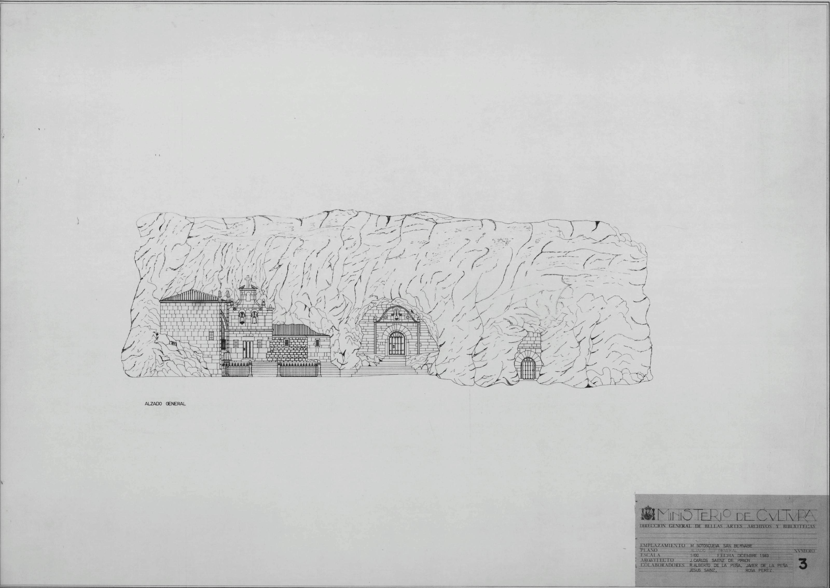 ERMITA DE SAN BERNABE -BURGOS-: ALZADO GENERAL . Alzado de la Ermita y de las cuevas, plano sin cotas.Estos planos estan realizados por personas contratadas por el INEM.