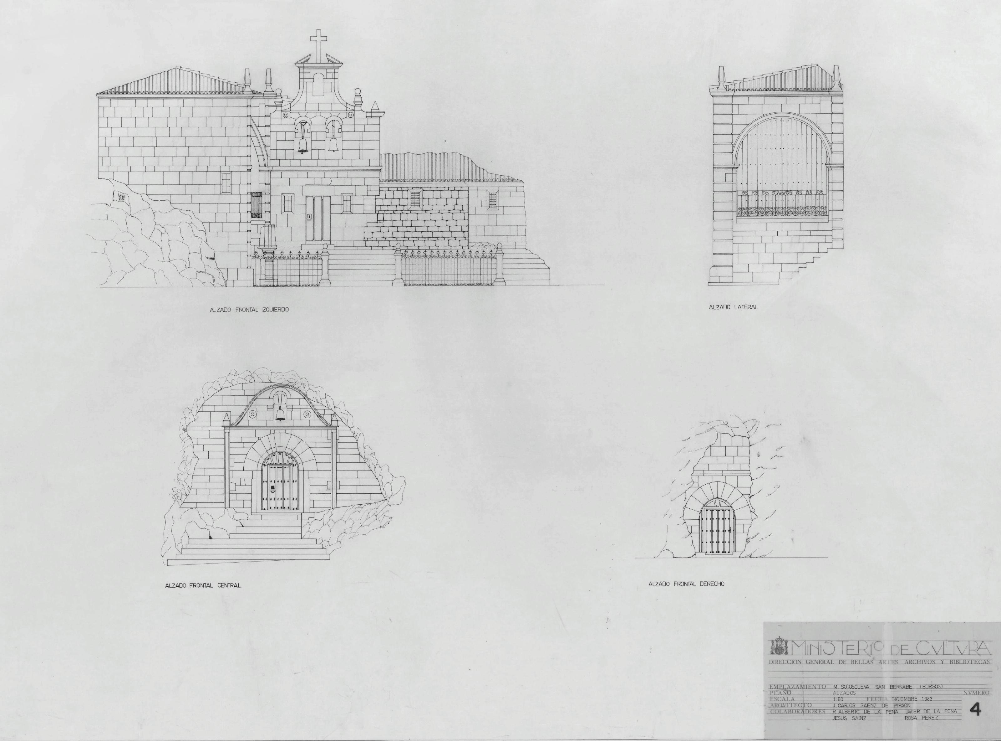ERMITA DE SAN BERNABE -BURGOS-: ALZADO frontal izquierdo, ALZADO frontal central, ALZADO lateral y ALZADO frontal derecho , estos alzados pertenecen a la Ermita y las cuevas del entorno , planos sin cotas.Estos planos estan realizados por personas contratadas por el INEM.