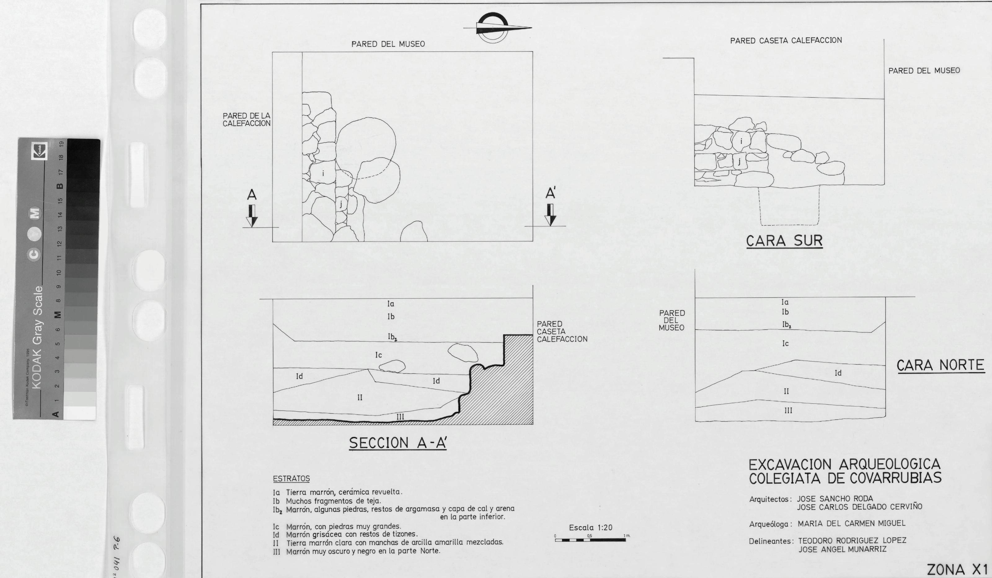 COLEGIATA DE COVARRUBIAS -BURGOS- EXCAVACION ARQUEOLOGICA.: PLANO DE DETALLES, PARED EXTERIOR DEL MUSEO . Leyenda de estratos detallada., Seccion A-A , cara norte y cara sur.