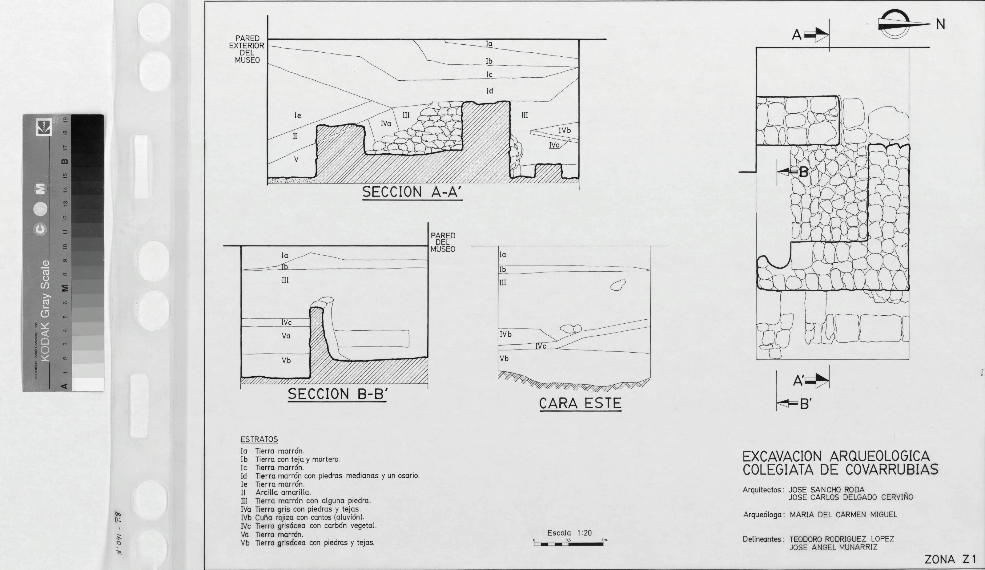 COLEGIATA DE COVARRUBIAS -BURGOS- EXCAVACION ARQUEOLOGICA.: PLANO DE DETALLES, PARED EXTERIOR DEL MUSEO . Leyenda de estratos detallada., cara este. planta y secciones A-A , B-B.