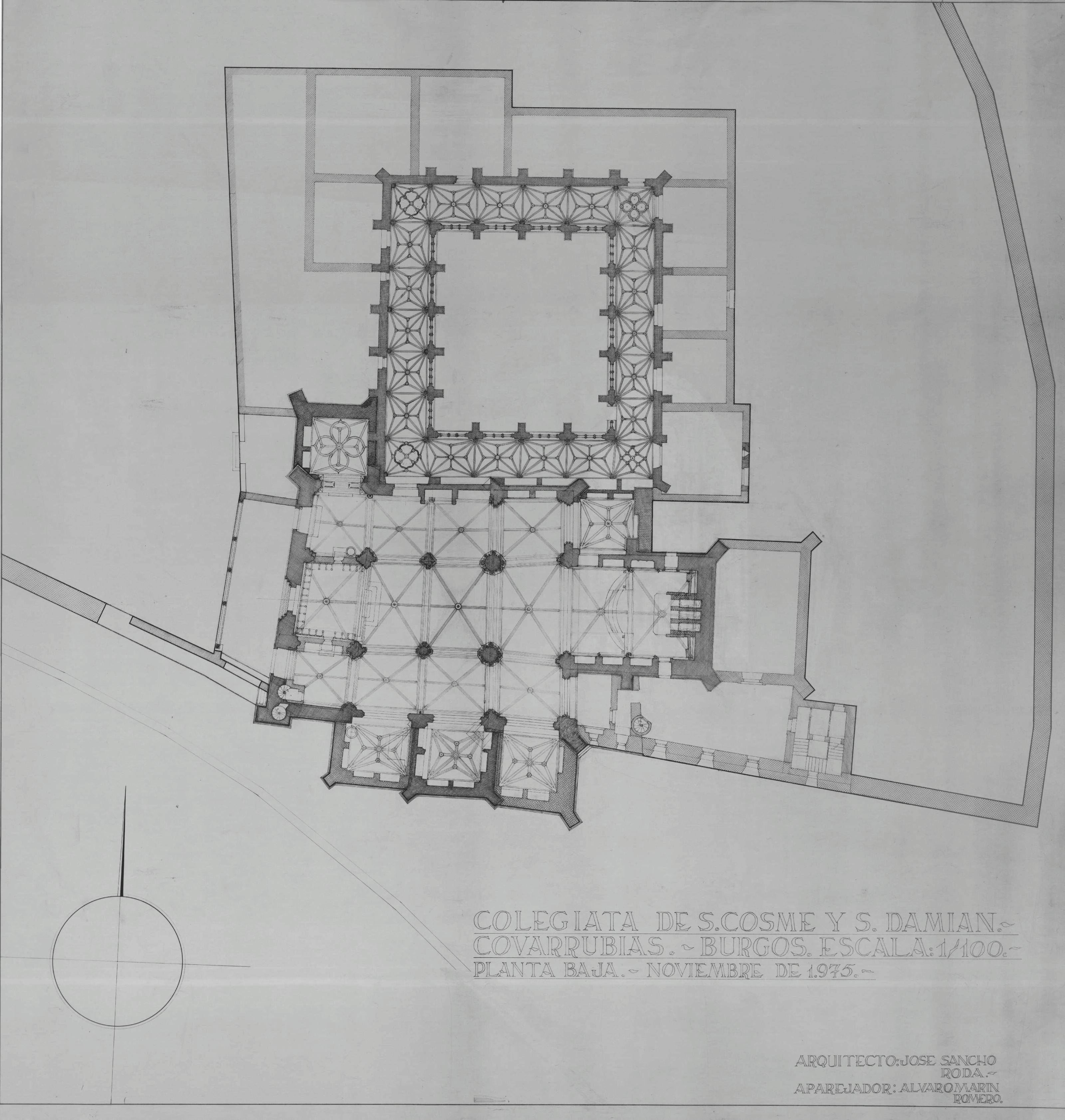 COLEGIATA DE COVARRUBIAS -BURGOS-: PLANTA BAJA . Plano con representacion de proyeccion de bovedas y techos , muros rayados con diferentes tratamientos, plano sin cotas y sin mas documentacion.