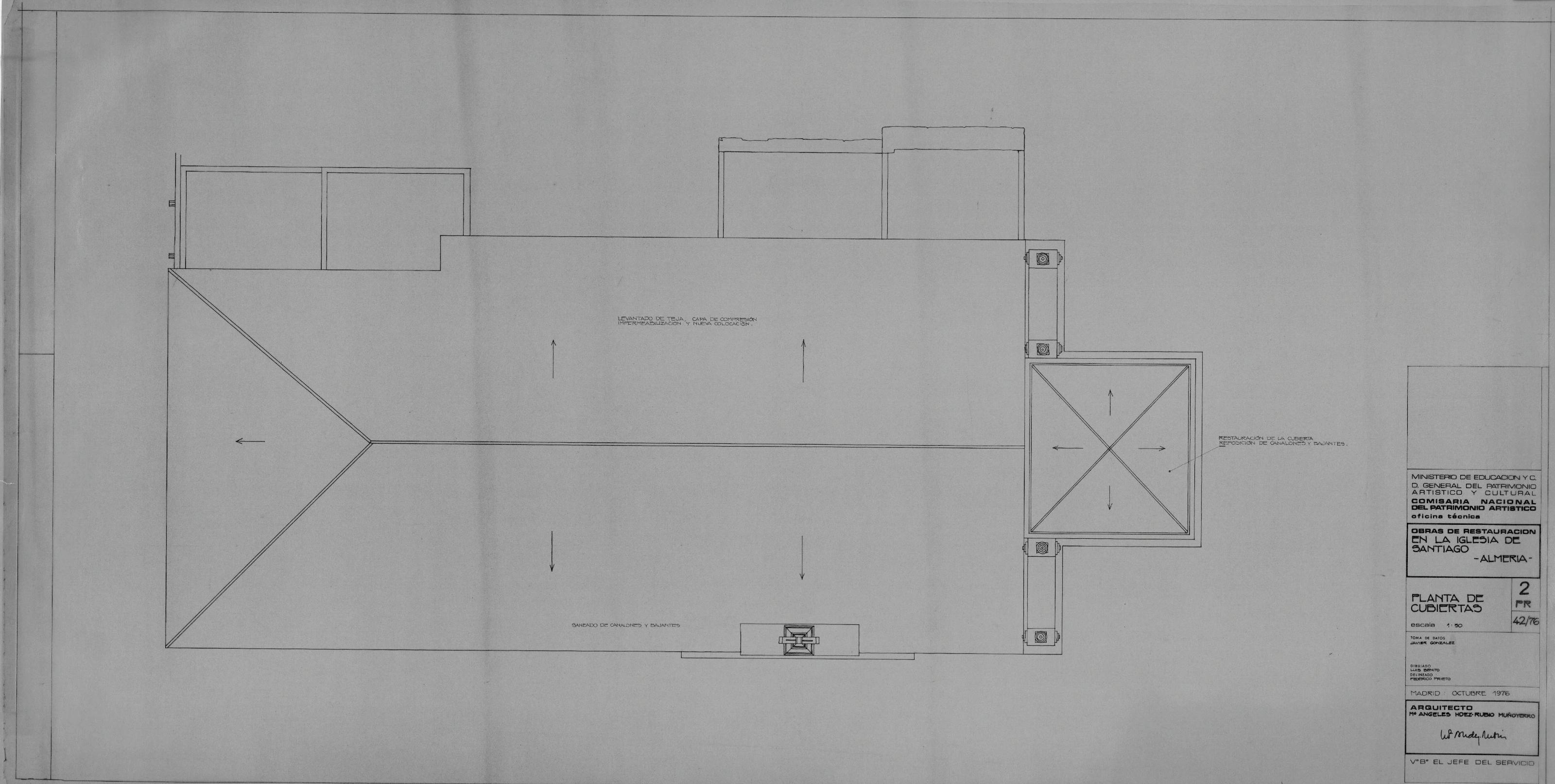OBRAS DE RESTAURACION EN LA IGLESIA DE SANTIAGOALMERIA: PLANTA DE CUBIERTASCon anotaciones sobre zonas a restaurary reposiciones de canalones y bajantes