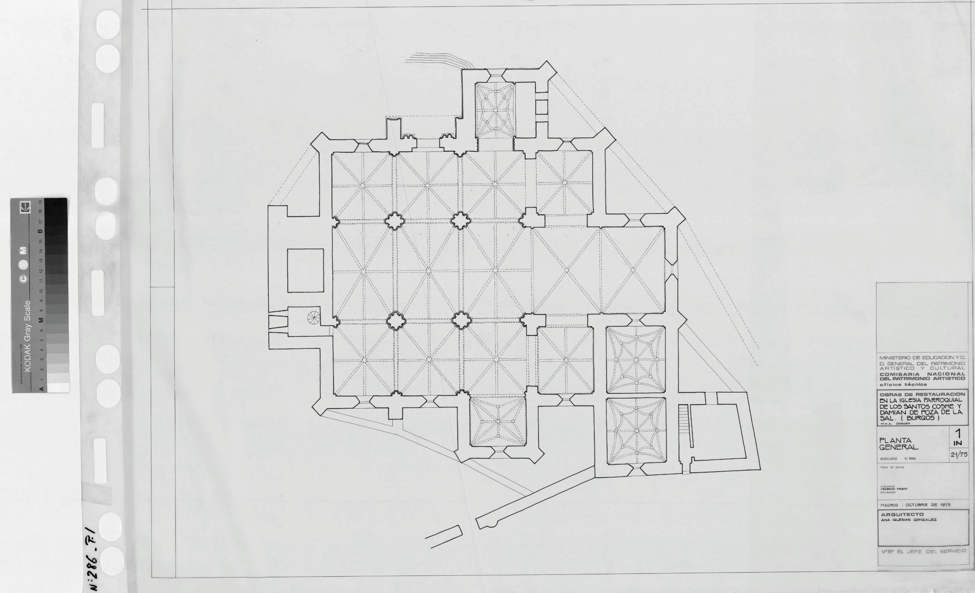 IGLESIA PARROQUIAL DE SAN COSME Y SAN DAMIAN. -BURGOS -: PLANTA GENERAL. Planta general , con proyeccion de techos y bovedas, muros regruesados, plano sin acotar.