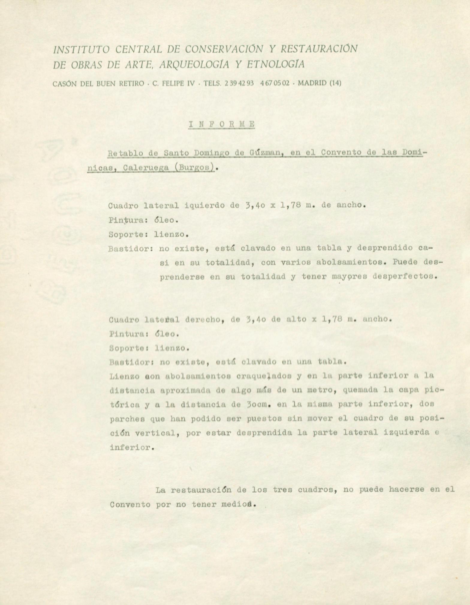 Informe de conservación de lienzos pertenecientes al retablo de la iglesia del Convento de las Reverendas Madres Dominicas de Santo Domingo de Guzmán en Caleruega (Burgos)