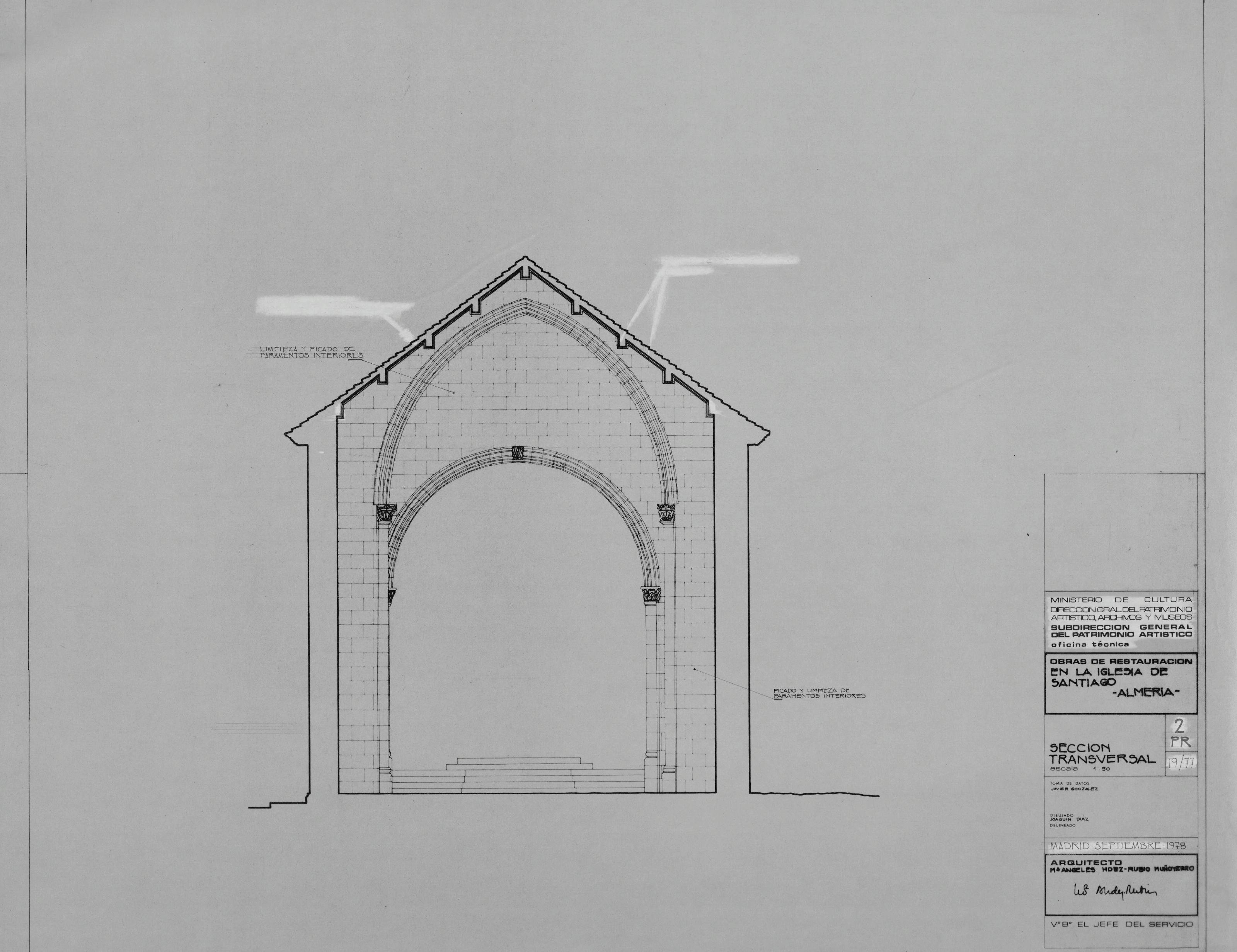 OBRAS DE RESTAURACION EN LA IGLESIA DE SANTIAGOALMERIA: SECCION TRANSVERSALCon anotaciones sobre zonas a picar y limpiaren paramentos interiores
