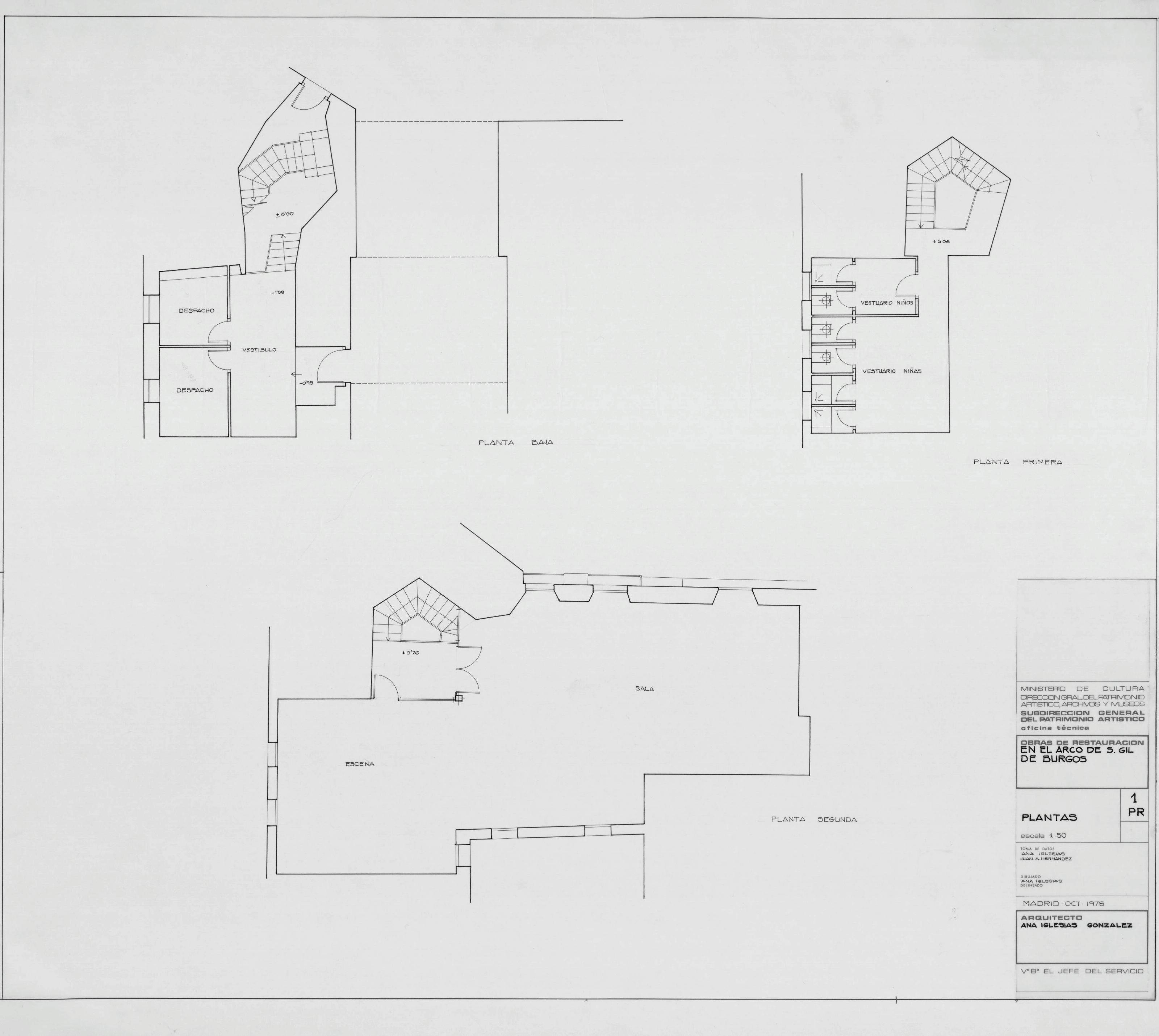 ARCO DE SAN GIL. -BURGOS-: PLANTAS. Baja , primera , y segunda . Planos de distribucion con alguna cota de altura , y dependencias marcadas.