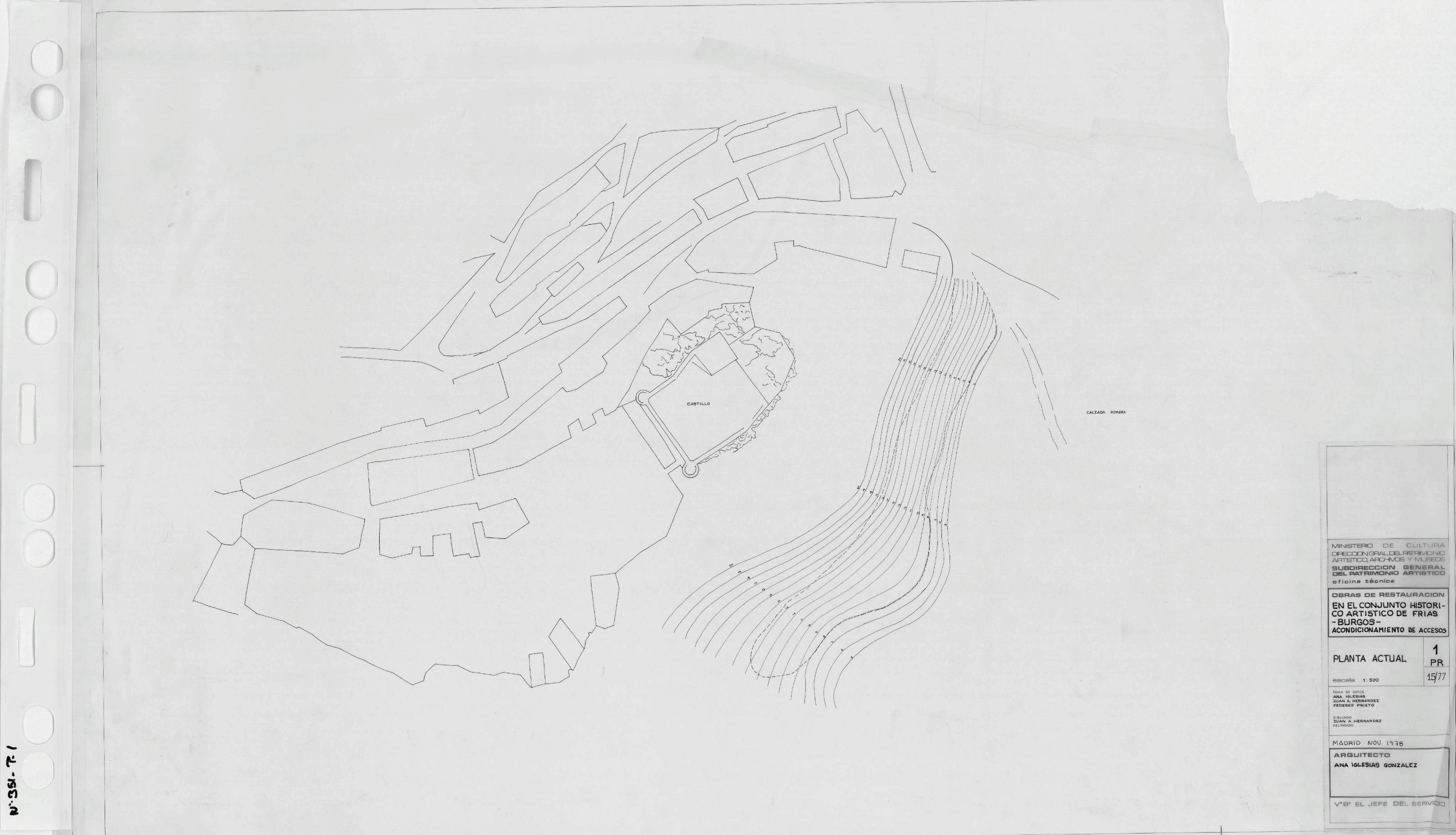 CONJUNTO HISTORICO ARTISTICO DE FRIAS- BURGOS -: PLANTA ACTUAL. Acondicionamiento de accesos, plano de emplazamiento del conjunto, resalta el recinto del castillo, con curvas de nivel.