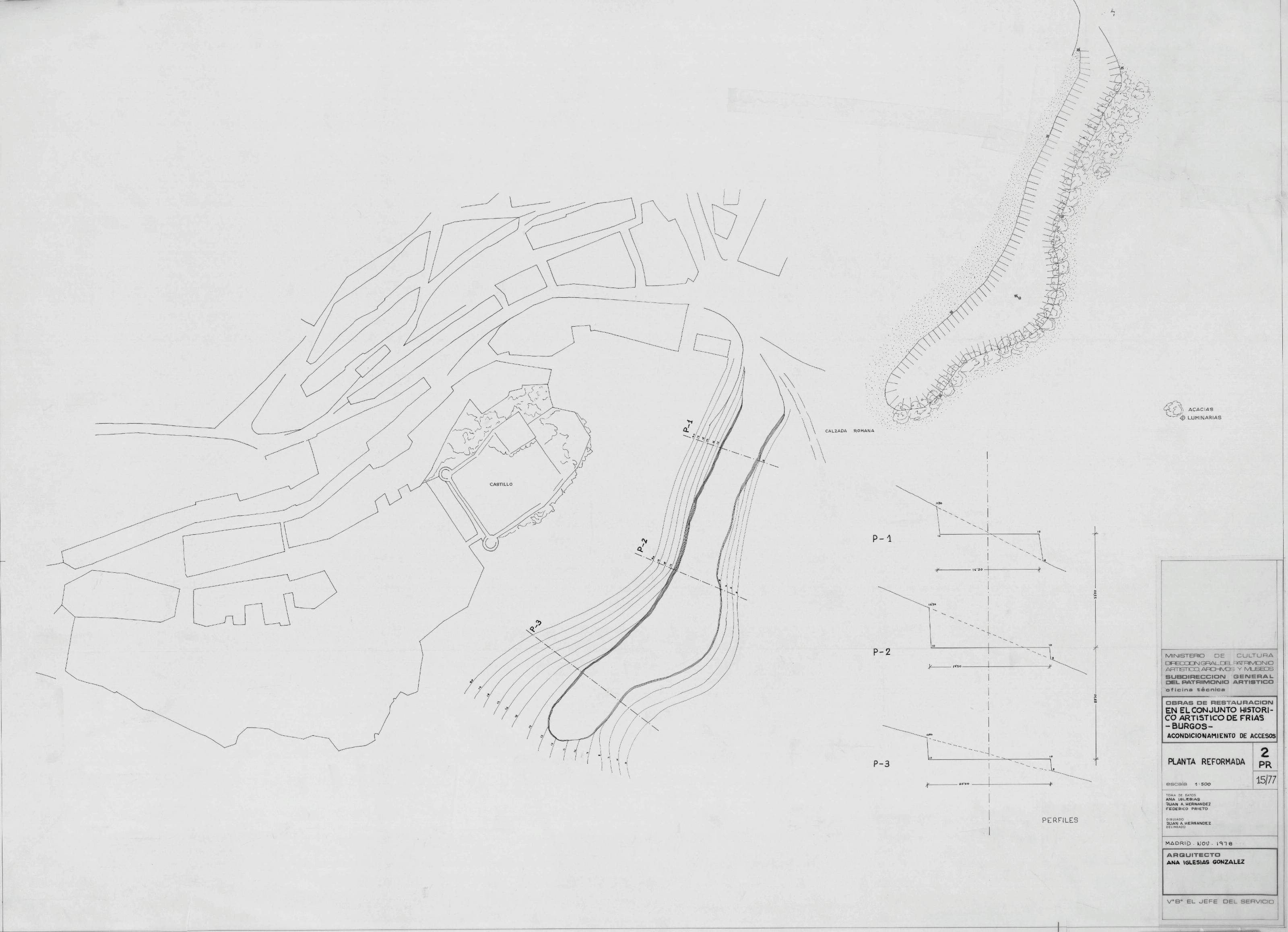 CONJUNTO HISTORICO ARTISTICO DE FRIAS- BURGOS -: PLANTA REFORMADA. Acondicionamiento de accesos, plano de emplazamiento del conjunto, resalta el recinto del castillo, con curvas de nivel, en el plano aparecen unos perfiles de las curvas de nivel acotadas.