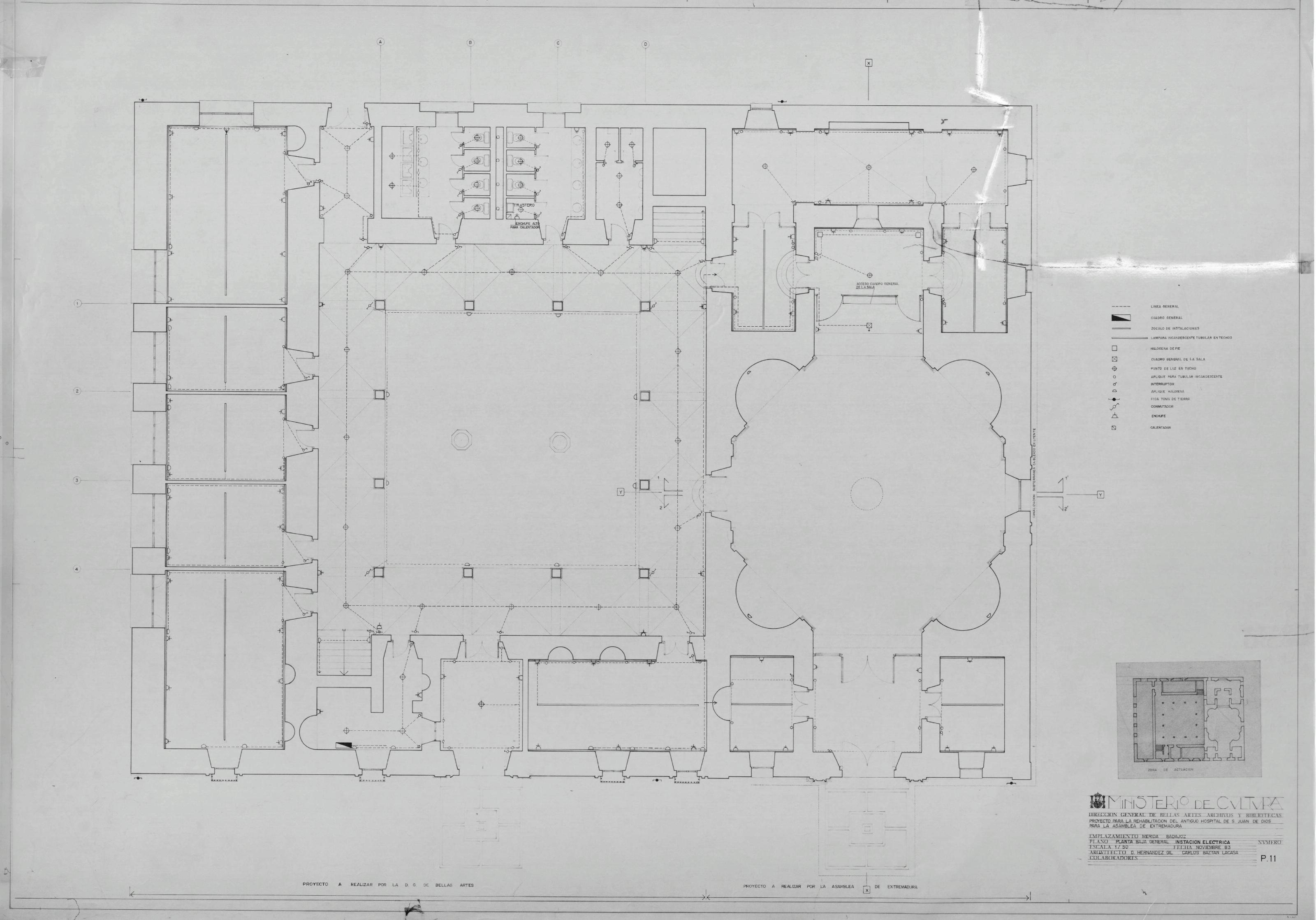 ASAMBLEA DE EXTREMADURA PROYECTO DE REHABILITACIÓN DEL ANTIGUO HOSPITAL DE S. JUAN DE DIOS PARA SEDE DE LA ASAMBLEA: PLANTA BAJA GENERAL INSTALACION ELECTRICA Con símbolos conectados representando los diferentes mecanismos y leyenda. Sin firmar. Especifica zona de proyecto correspondiente a D.G.B.B.A.A. y a la Asamblea de Extremadura.