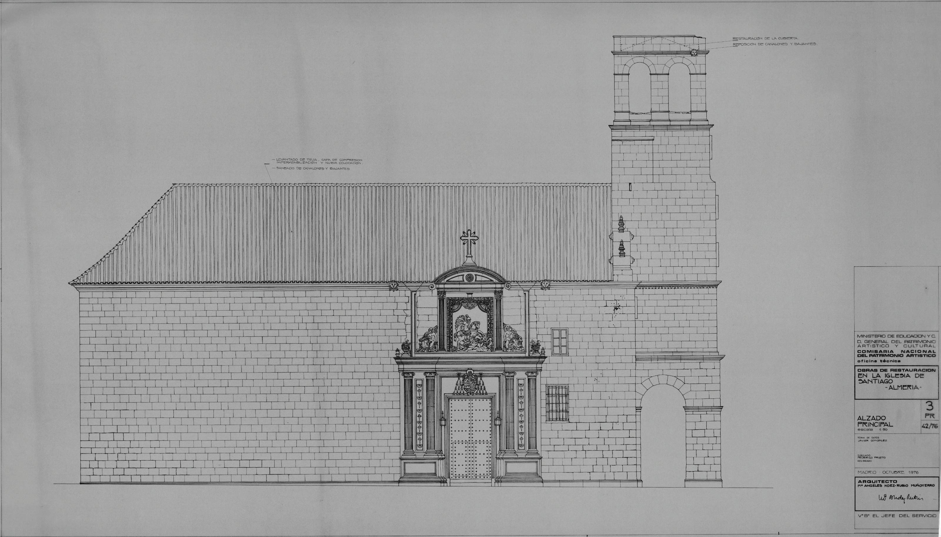 OBRAS DE RESTAURACION EN LA IGLESIA DE SANTIAGO ALMERIA: ALZADO PRINCIPAL Con anotaciones sobre restauración de cubiertas y reposición de canalones y bajantes
