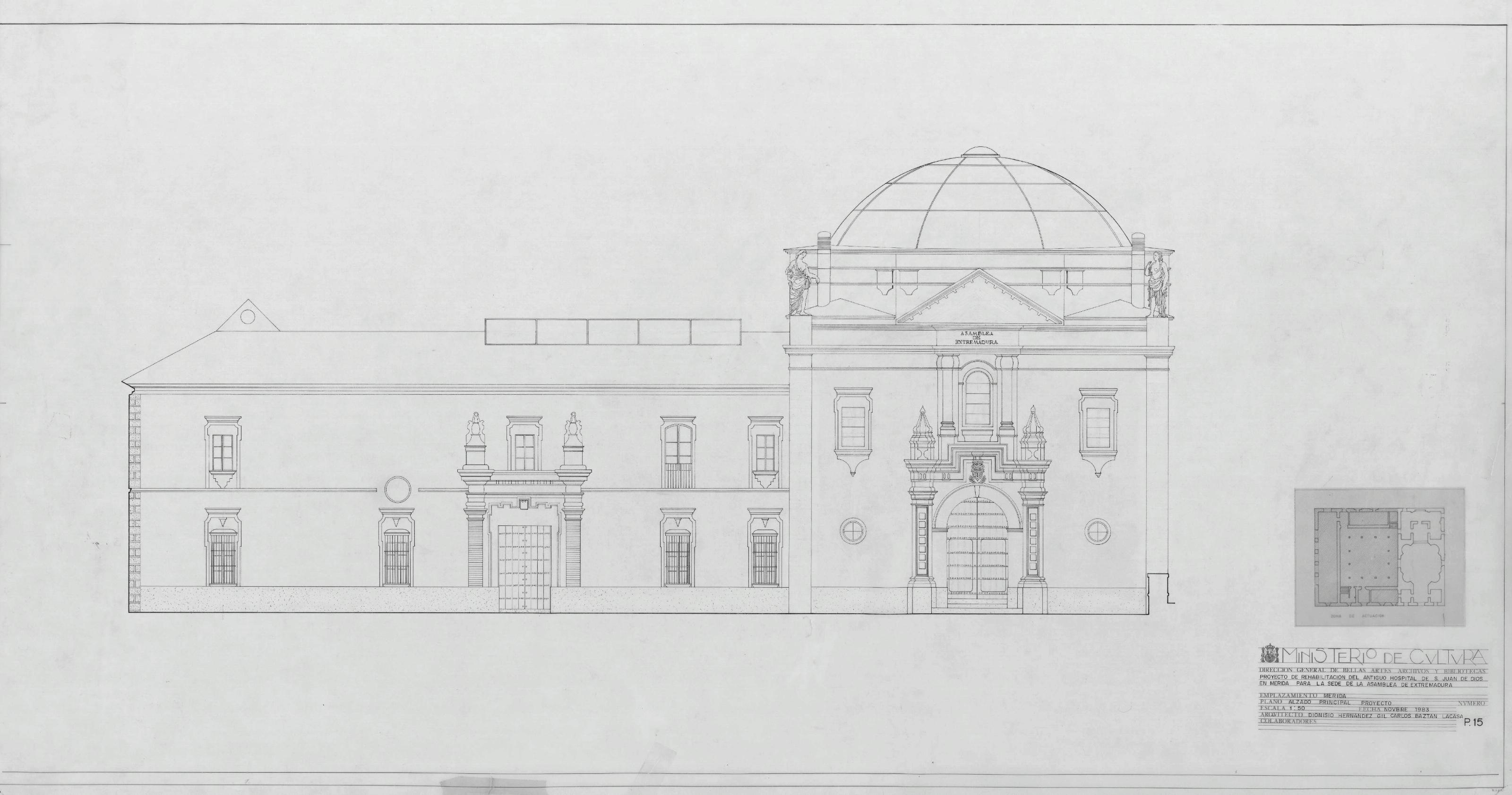 ASAMBLEA DE EXTREMADURA PROYECTO DE REHABILITACIÓN DEL ANTIGUO HOSPITAL DE S. JUAN DE DIOS PARA SEDE DE LA ASAMBLEA: ALZADO PRINCIPAL Figura en sello "PROYECTO " Buen detalle en línea fina de recercados y volúmenes Con dibujo en planta a pequeña escala determinando zona de actuación. Sin firmar