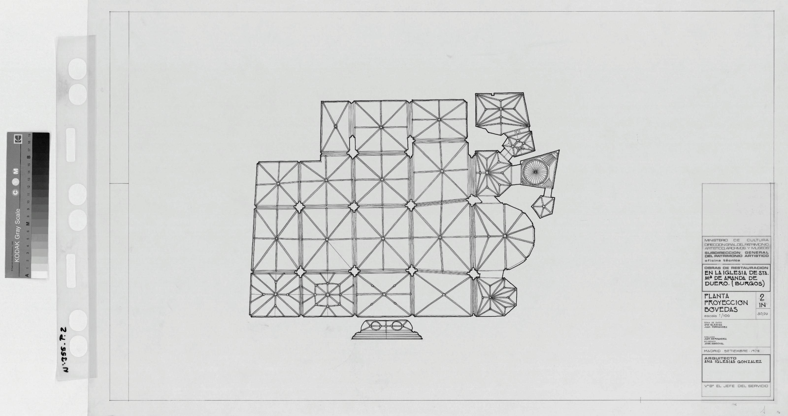 IGLESIA DE SANTA MARIA. BURGOS.: PLANTA PROYECCION DE BOVEDAS. Planta general de bovedas , con muros y pilares regruesados, plano sin acotar.