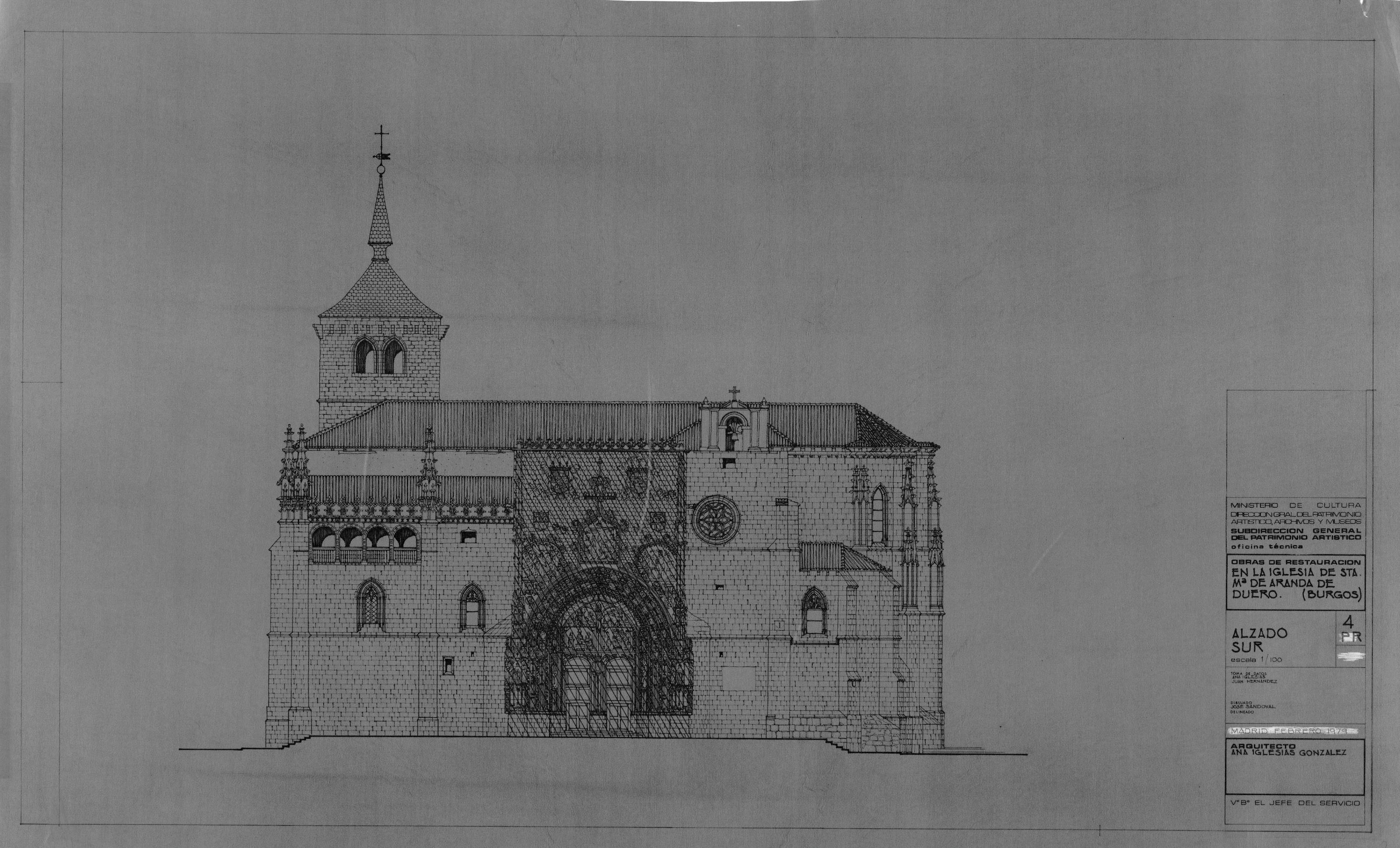 IGLESIA DE SANTA MARIA. BURGOS.: ALZADO SUR. Plano de fachada ,dibujado con muchos detalles, aparece una zona marcada a tratar, plano sin cotas.
