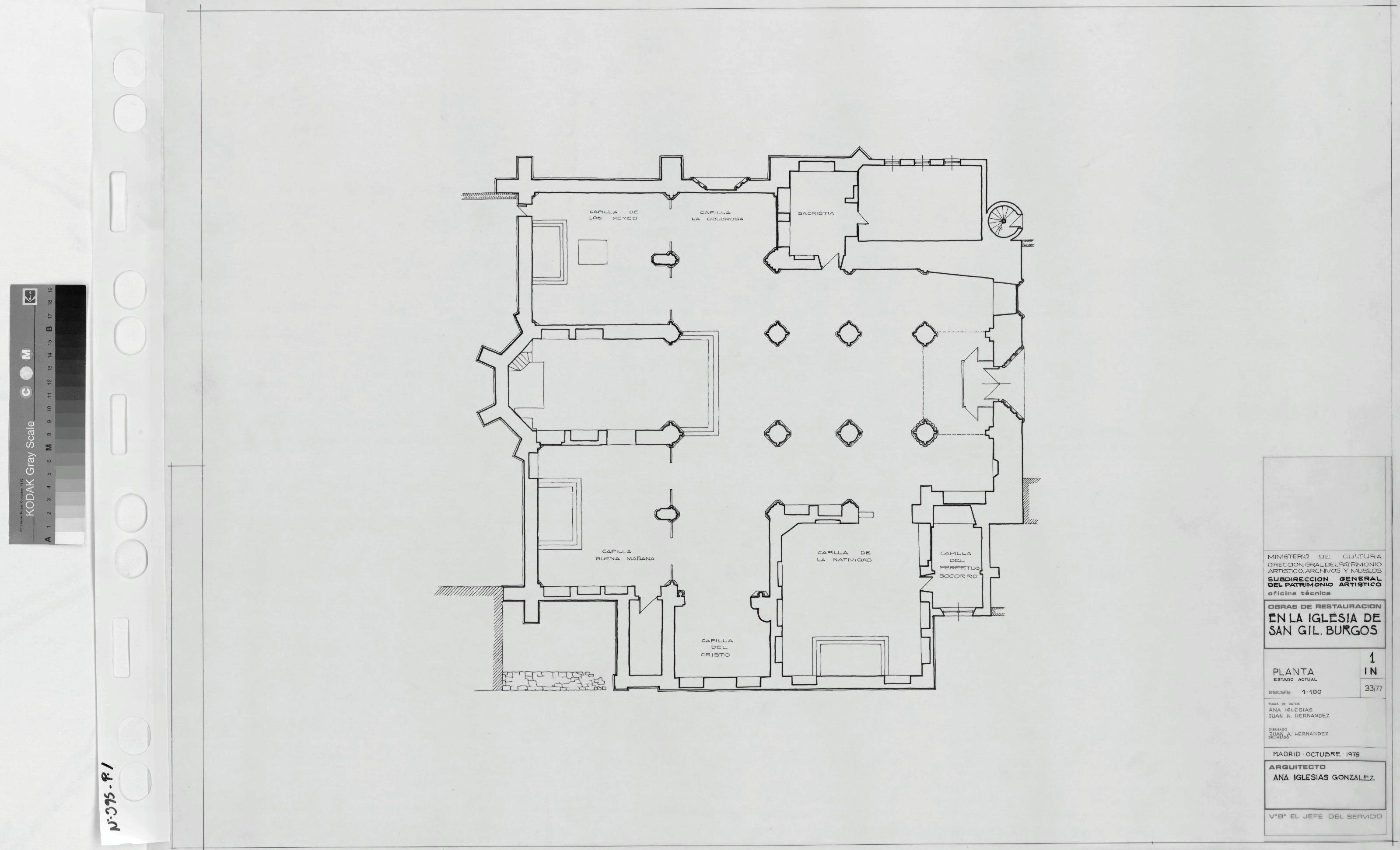 IGLESIA DE SAN GIL. BURGOS.: PLANTA GENERAL. Estado actual, en la planta aparecen marcadas las distintas capillas de la iglesia, junto con la sacristia, muros y pilares regruesados, plano sin cotas.