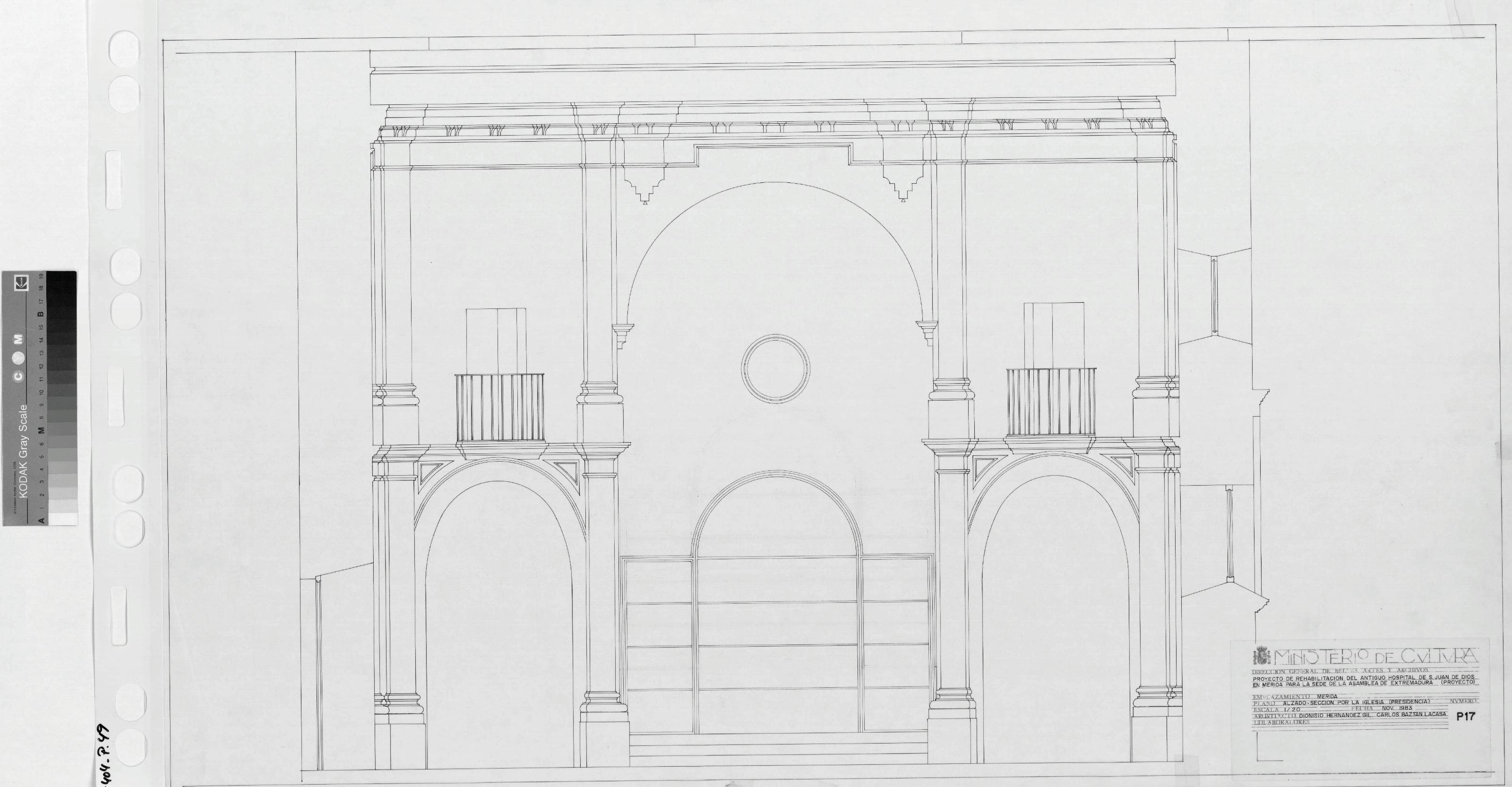 ASAMBLEA DE EXTREMADURA PROYECTO DE REHABILITACIÓN DEL ANTIGUO HOSPITAL DE S. JUAN DE DIOS PARA SEDE DE LA ASAMBLEA: ALZADO - SECCION POR LA IGLESIA (Presidencia) Bastante detallado Dibujado todo en línea fina sin cotas ni notas. Sin firmar
