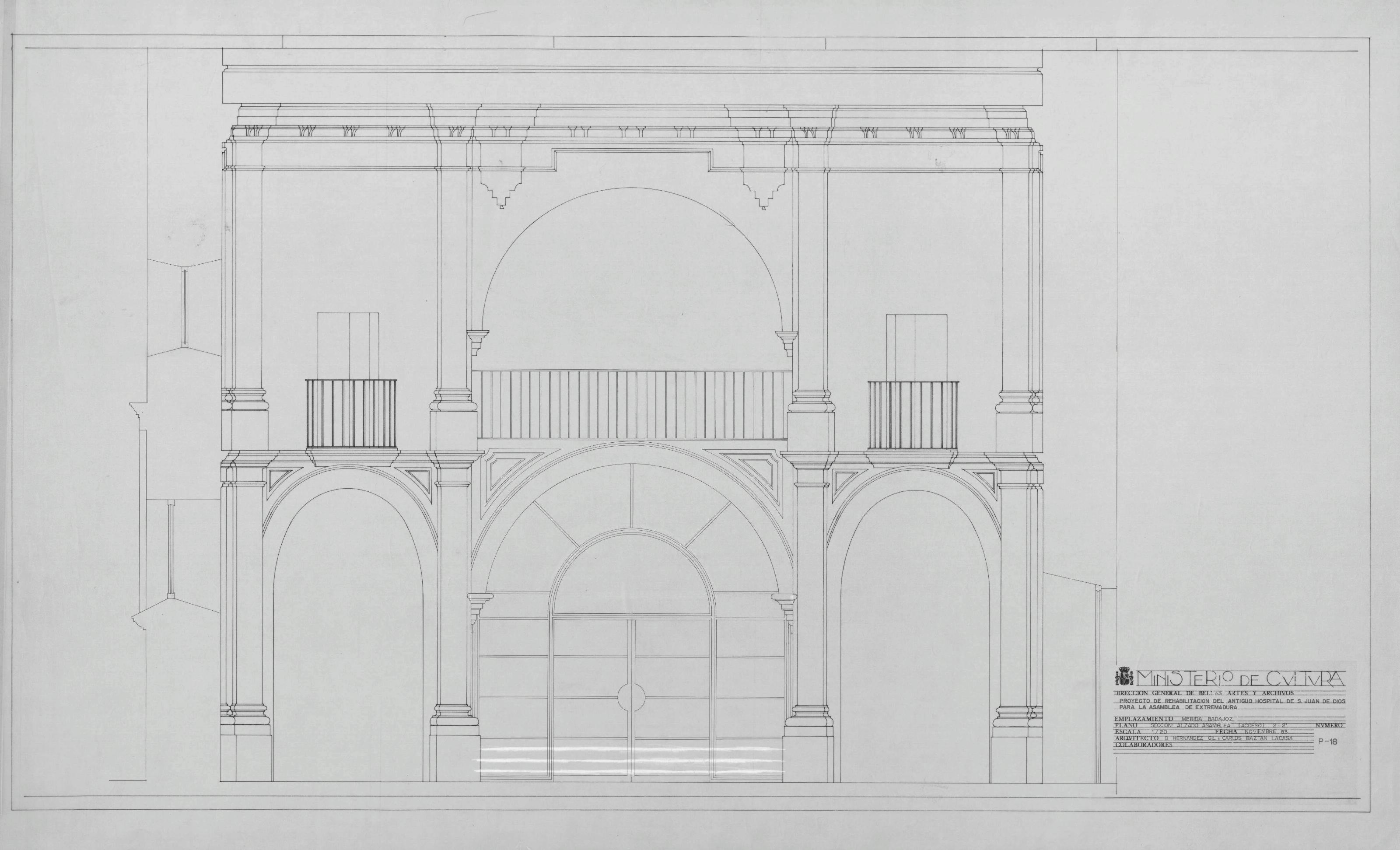 ASAMBLEA DE EXTREMADURA PROYECTO DE REHABILITACIÓN DEL ANTIGUO HOSPITAL DE S. JUAN DE DIOS PARA SEDE DE LA ASAMBLEA: ALZADO - SECCION 2-2¿ ASAMBLEA (Acceso) Bastante detallado Dibujado todo en línea fina sin cotas ni notas. Sin firmar