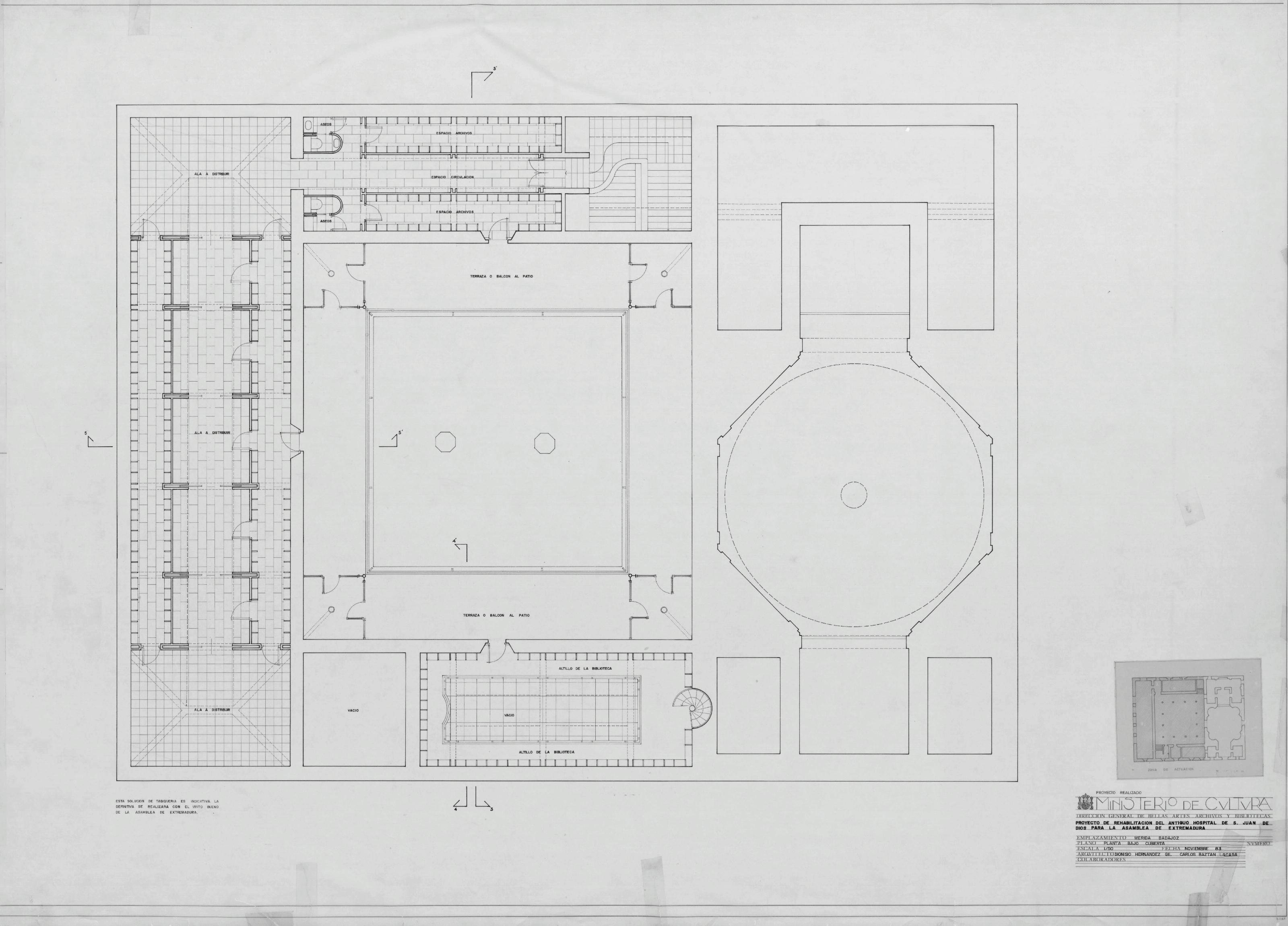 ASAMBLEA DE EXTREMADURA PROYECTO DE REHABILITACIÓN DEL ANTIGUO HOSPITAL DE S. JUAN DE DIOS PARA SEDE DE LA ASAMBLEA: PLANTA BAJO CUBIERTA Con distribución de estancias para archivos y despiece de solados Con denominación de usos y nota sobre la tabiquería Con líneas de sección 3-3¿, 4-4¿, y 5-5¿. Sin firmar
