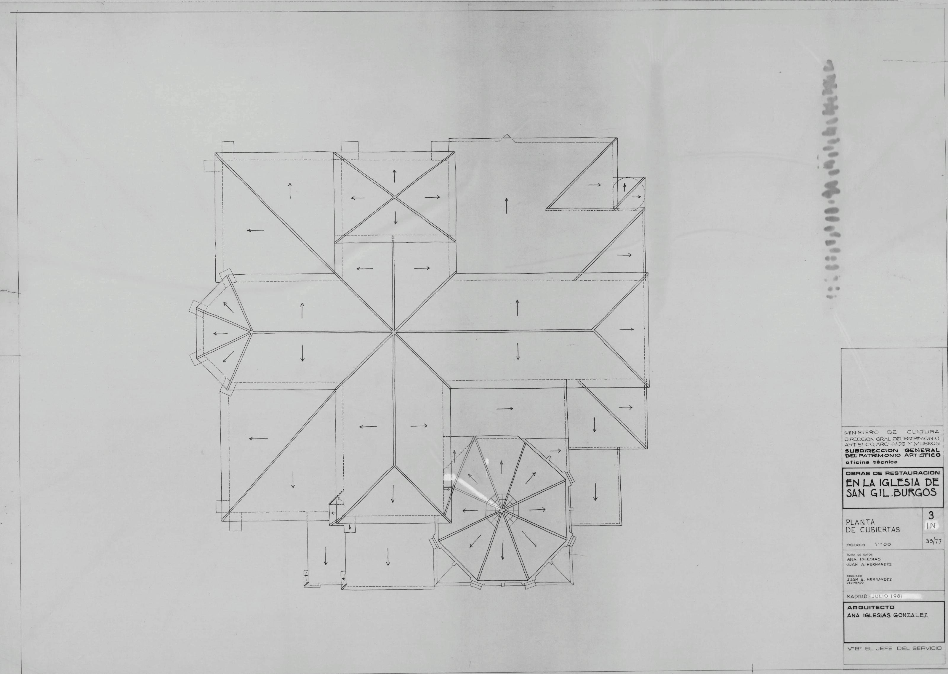 IGLESIA DE SAN GIL. BURGOS.: PLANTA DE CUBIERTAS. Plano sin cotas, aparece una modificacion en la cubierta de la torre..