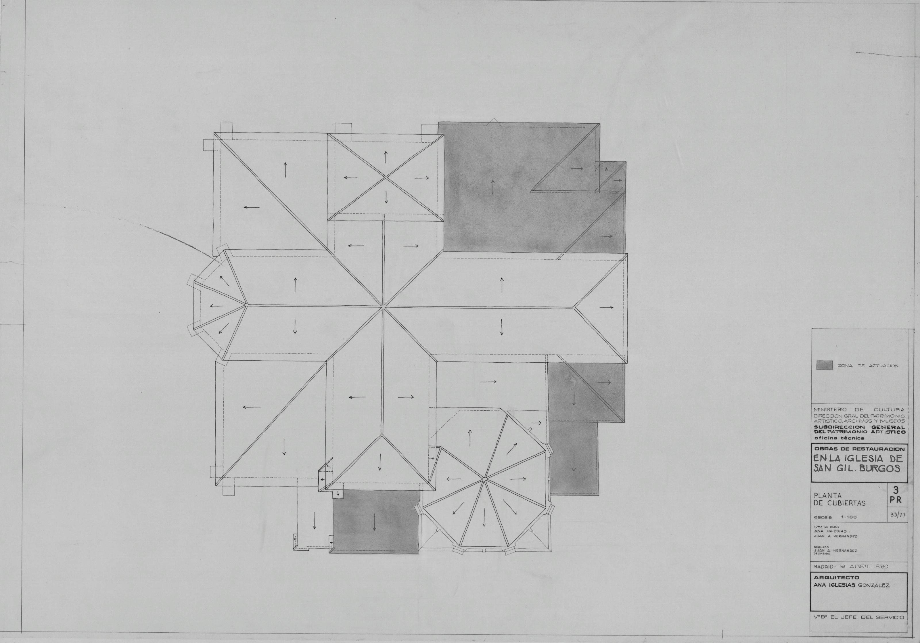IGLESIA DE SAN GIL. BURGOS.: PLANTA DE CUBIERTAS. En este plano aparece marcada una zona de actuacion, plano sin cotas.