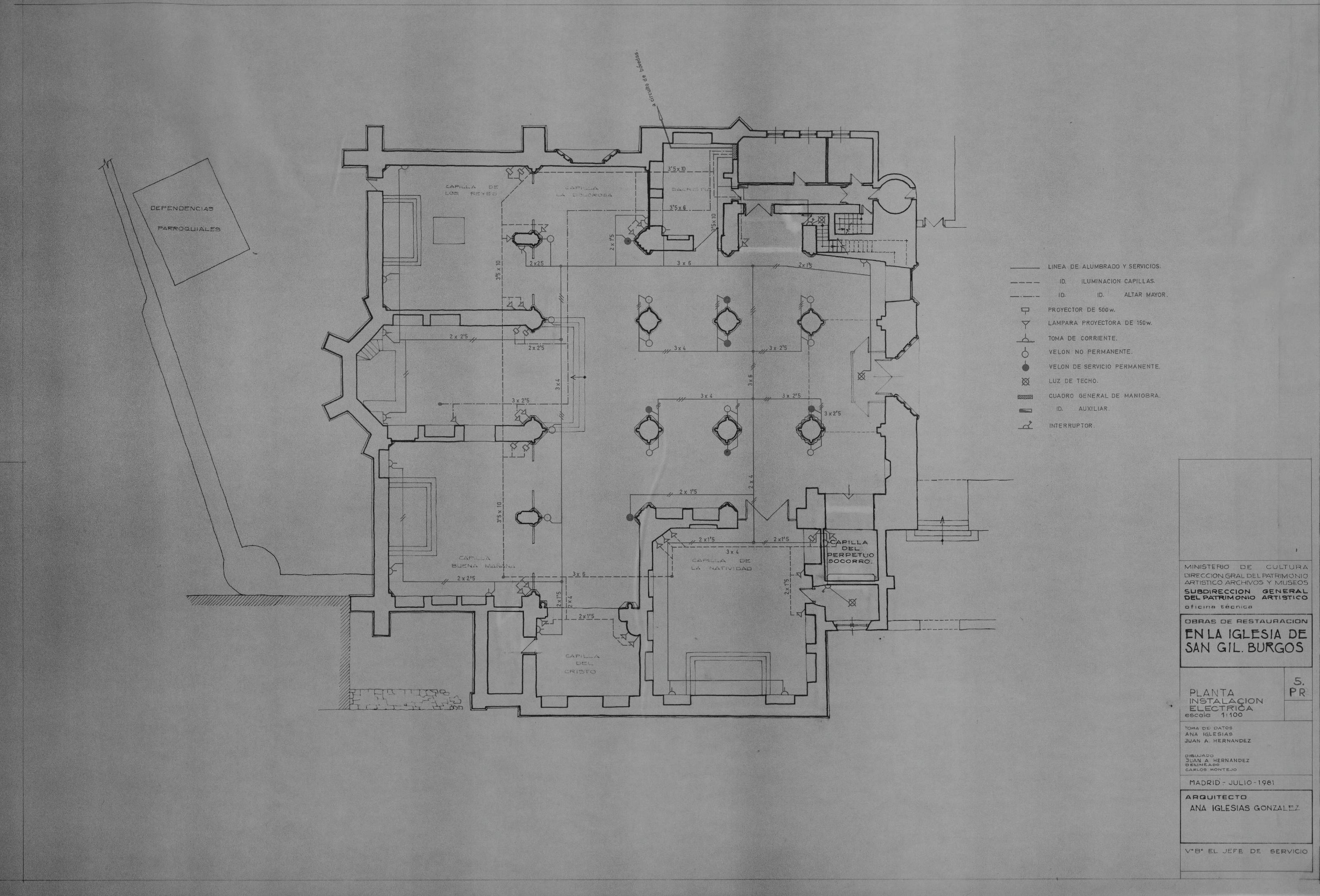 IGLESIA DE SAN GIL. BURGOS.: PLANTA. INSTALACION ELECTRICA. En este plano aparece marcada toda la instalacion electrica de la planta, junto con la leyenda, plano sin cotas.