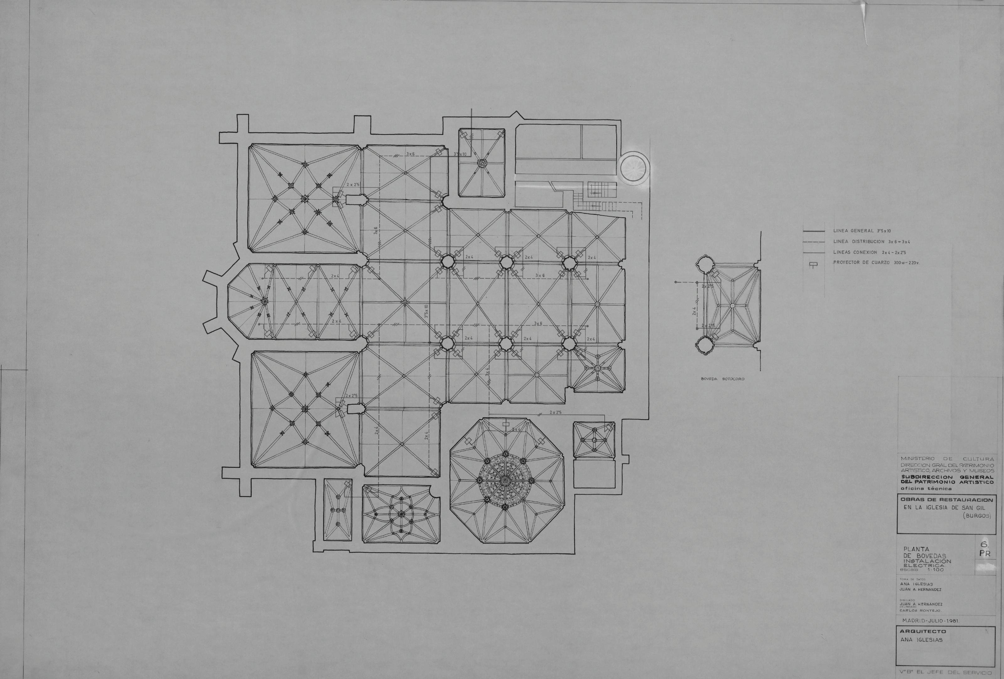 IGLESIA DE SAN GIL. BURGOS.: PLANTA. De BOVEDAS. INSTALACION ELECTRICA. En este plano aparece marcada toda la instalacion electrica de la planta, junto con la leyenda, plano sin cotas.
