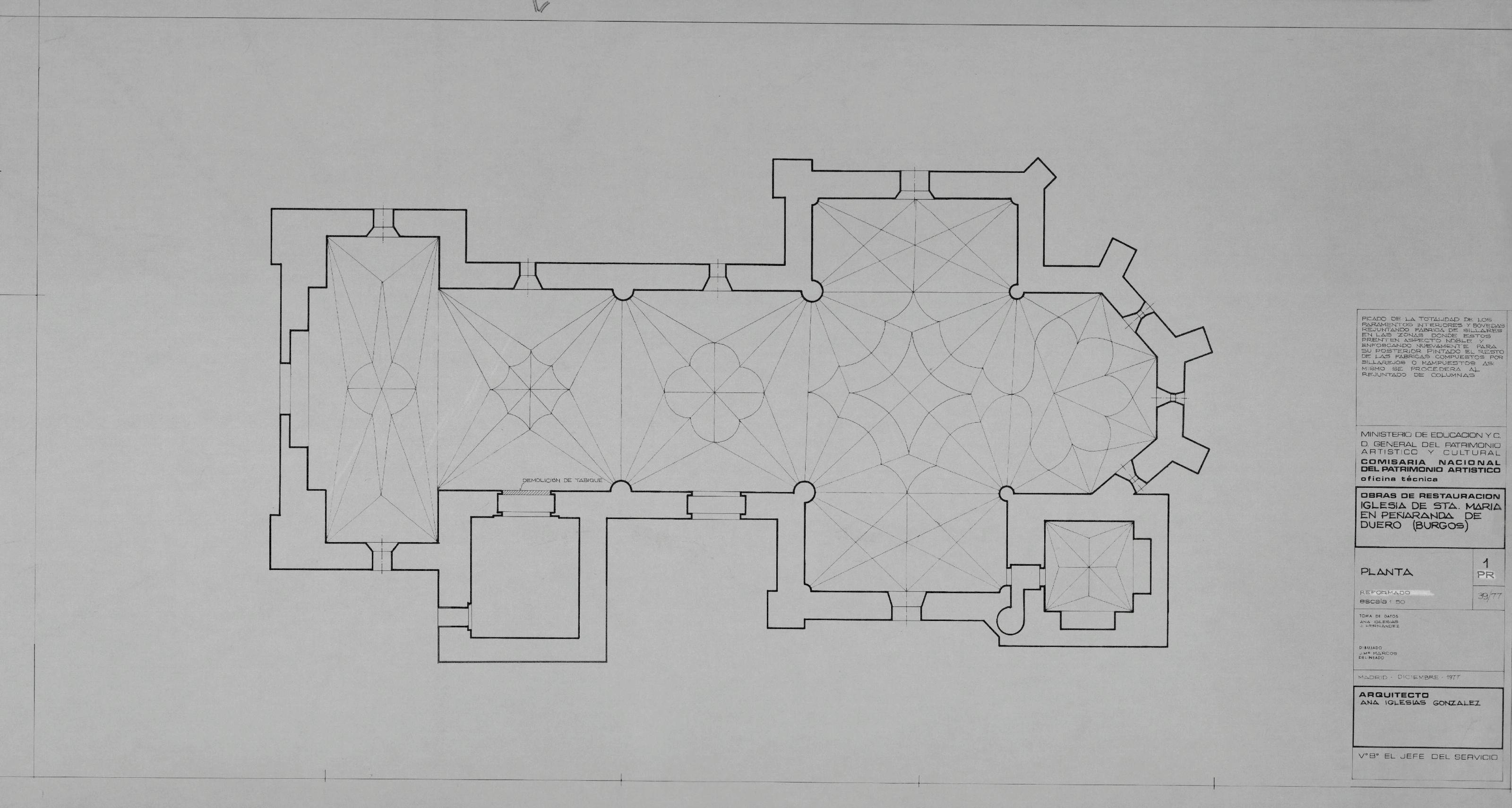 IGLESIA DE SANTA MARIA - PEÑARANDA DE DUERO - .BURGOS -: PLANTA .Reformado, planta general de proyecciones donde aparece marcado el tabique a demoler.plano sin cotas.