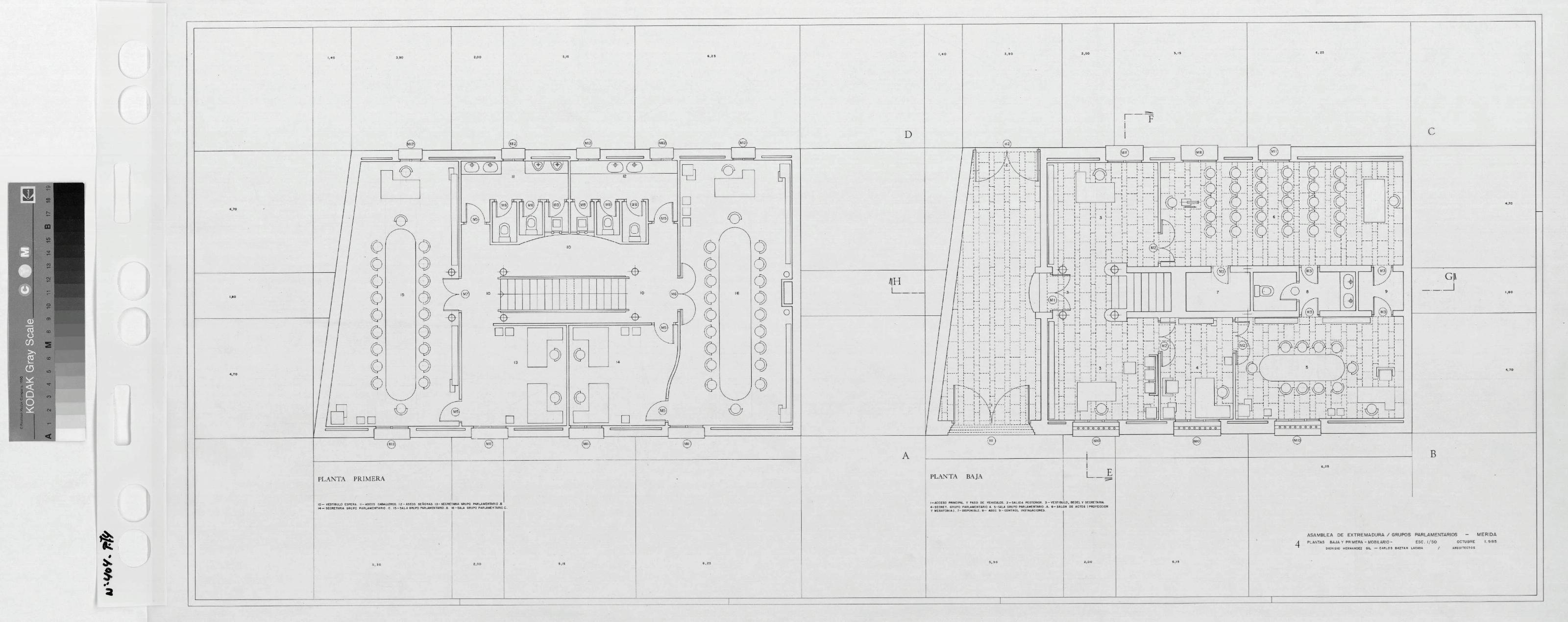 ASAMBLEA DE EXTREMADURA PROYECTO DE REHABILITACIÓN DEL ANTIGUO HOSPITAL DE S. JUAN DE DIOS PARA SEDE DE LA ASAMBLEA: PLANTAS BAJA Y PRIMERA MOBILIARIO Pone en sello " Asamblea de Extremadura - Grupos Parlamentarios" Con cotas y denominación de usos, mobiliario, despiece de solados y líneas de sección. Sin firmar