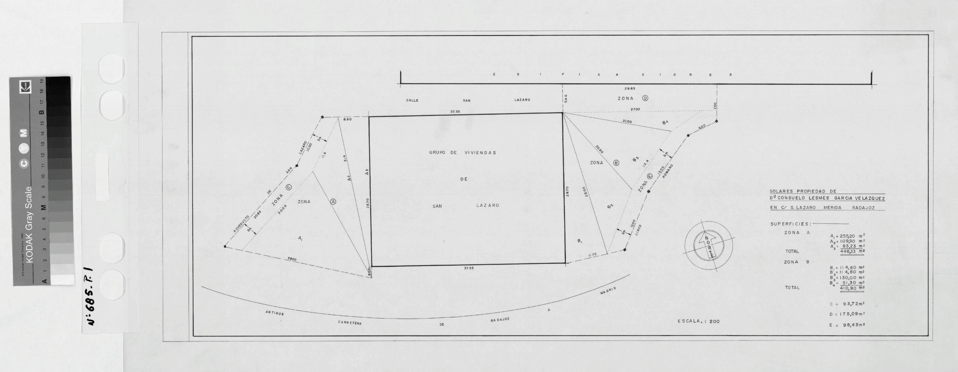 CIRCO ROMANO DE MERIDA(Badajoz): PLANO DE FINCA MANCOMUNADA AL CIRCOSolares adyacentes con cotas referenciadas al circo, superficies por zonas y propietarios