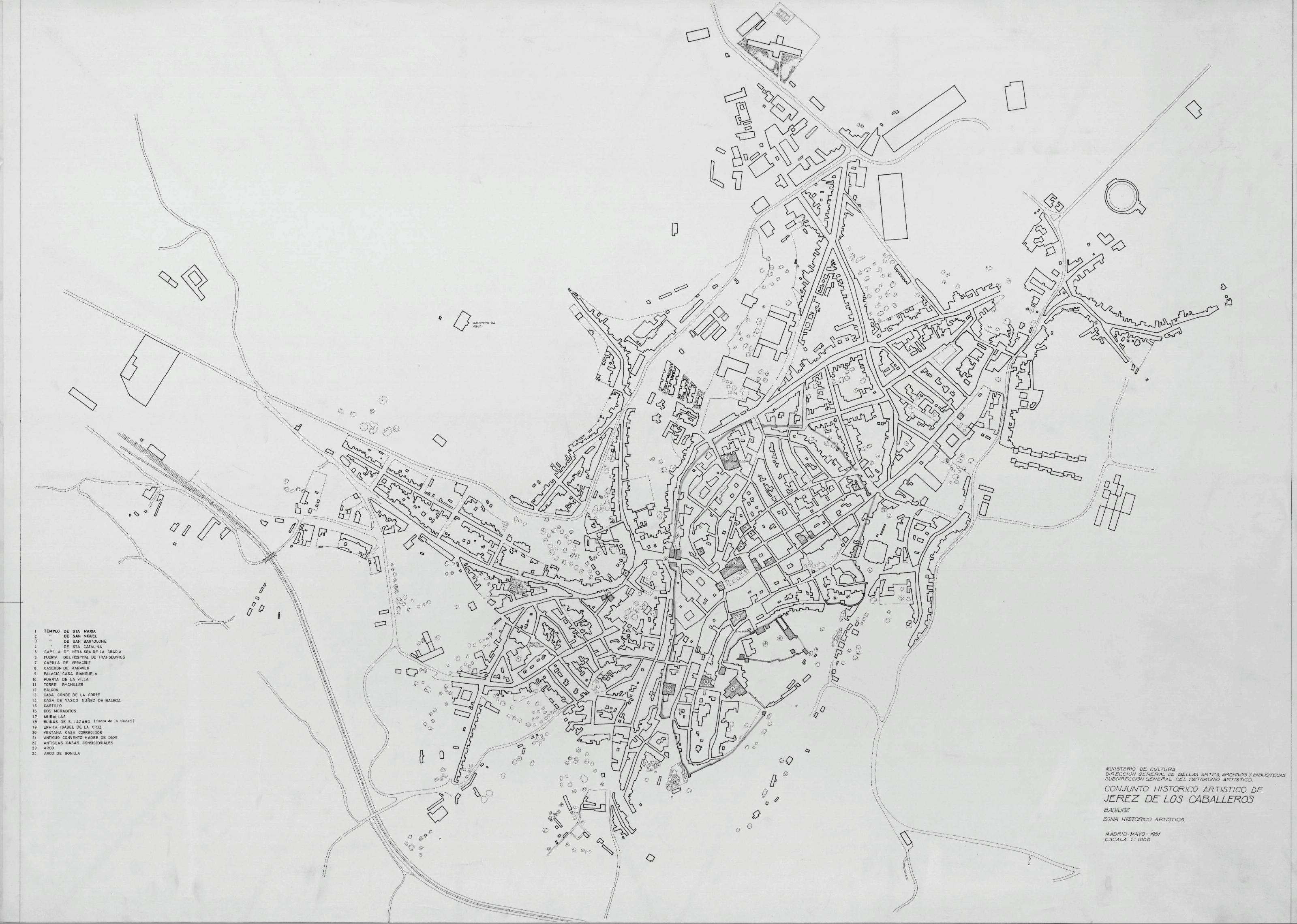 CONJUNTO HISTORICO ARTISTICO DE JEREZ DE LOS CABALLEROS. (Badajoz): PLANO GENERAL - Zona histórico Artística Representa toda la ciudad. Numerados y regruesados en plano 24 edificios y sitios de interés que se definen en leyenda. Sin firmar