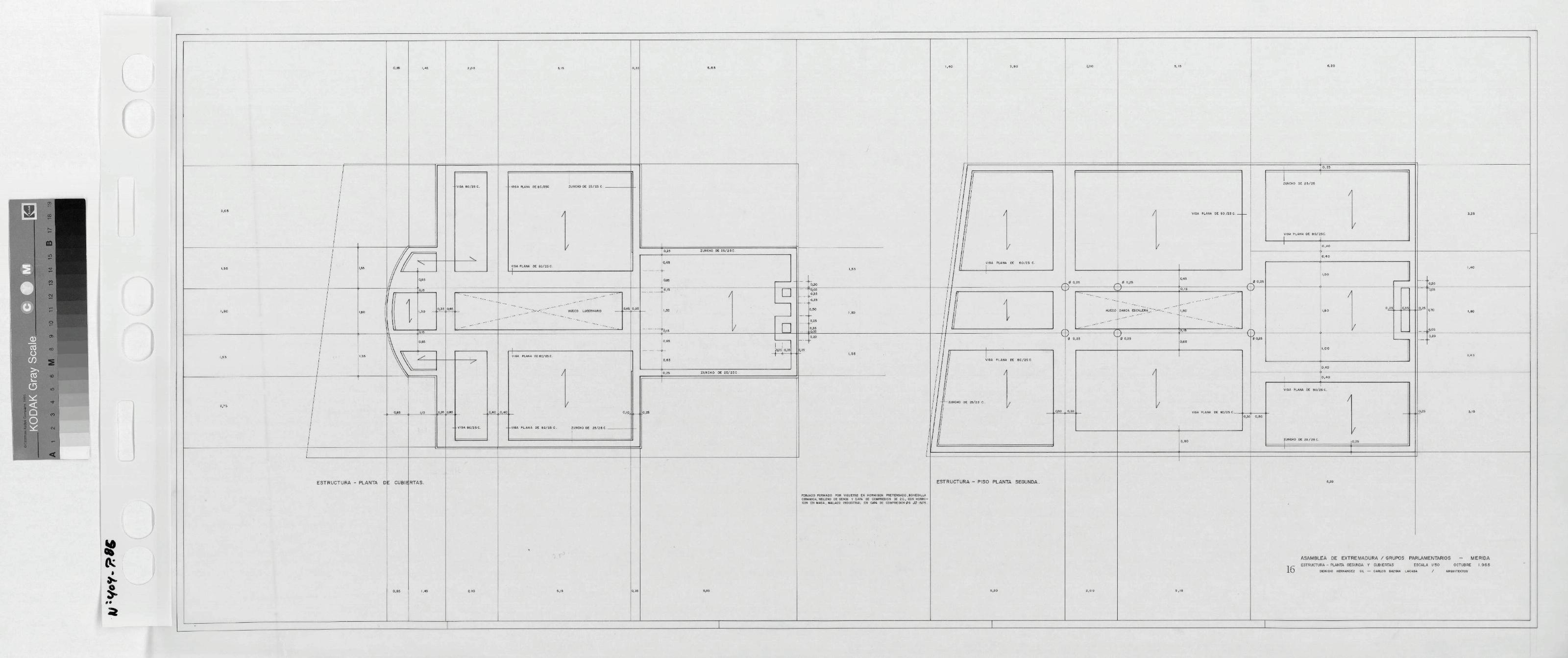 ASAMBLEA DE EXTREMADURA PROYECTO DE REHABILITACIÓN DEL ANTIGUO HOSPITAL DE S. JUAN DE DIOS PARA SEDE DE LA ASAMBLEA: PLANTAS SEGUNDA Y CUBIERTA - ESTRUCTURA Pone en sello " Asamblea de Extremadura - Grupos Parlamentarios" Con zunchado y direccion de viguetas. Con cotas y notas. Sin firmar